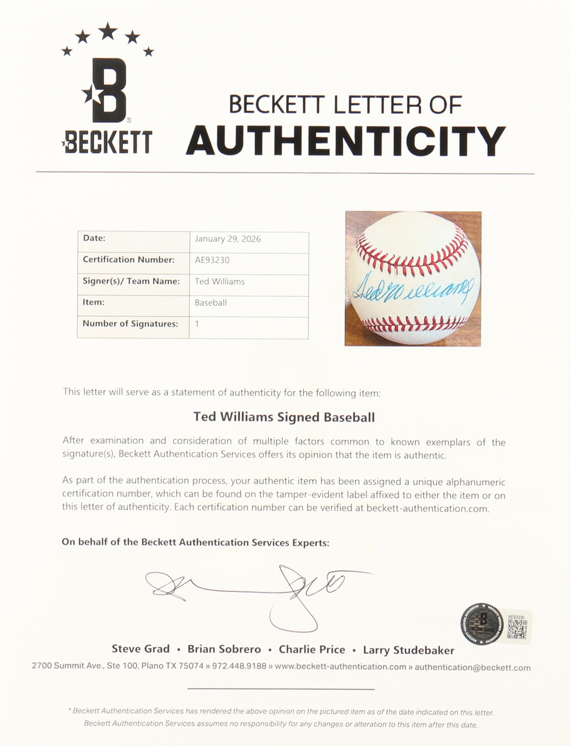 The autograph includes an official Beckett Authentication Services hologram and matching LOA for authenticity purposes.