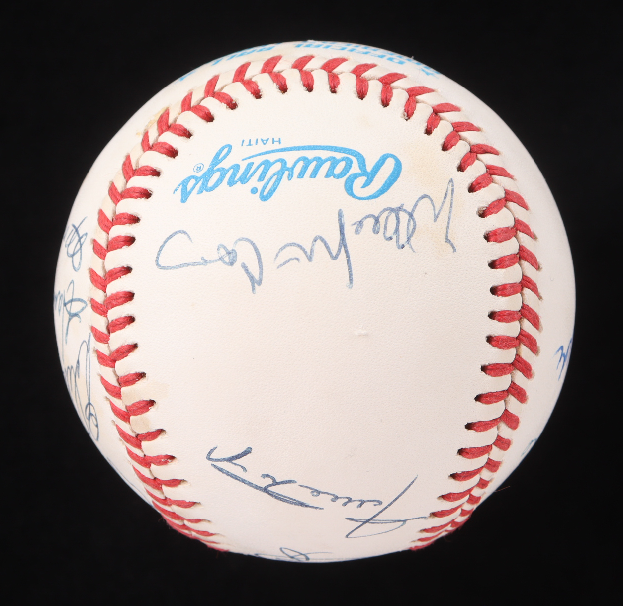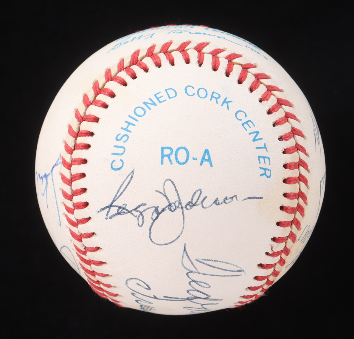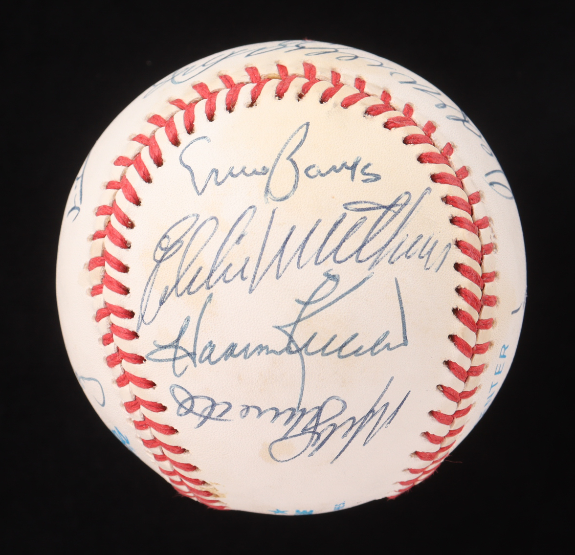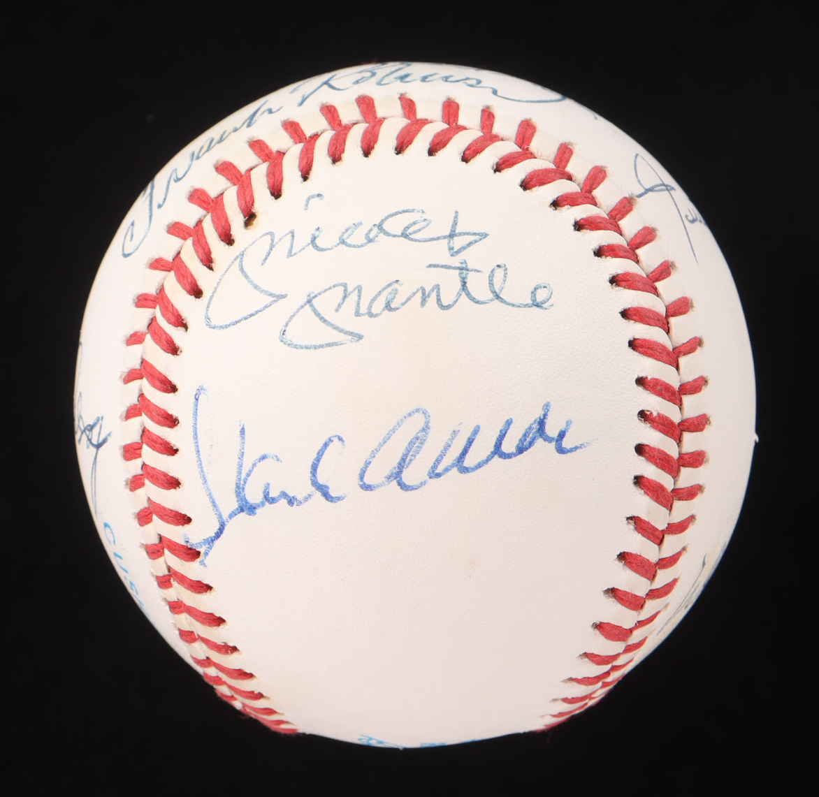Rawlings Official American League Baseball has been hand-signed by (11) with Ted Williams (D. 2002, Boston Red Sox, HOF), Frank Robinson (D. 2019, Cincinnati Reds, HOF), Reggie Jackson (New York Yankees, HOF), Willie Mays (D. 2024, San Fransisco Giants, HOF), Willie McCovey (D. 2018, San Fransisco Giants, HOF), Ernie Banks (D. 2015, Chicago Cubs, HOF), Eddie Mathews (D. 2001, Atlanta Braves, HOF) Harmon Killebrew (D. 2011, Minnesota Twins, HOF), Mike Schmidt (Philadelphia Phillies, HOF), Hank Aaron (D. 2021, Atlanta Braves, HOF) and Mickey Mantle (D. 1995, New York Yankees, HOF). Please see photos for more details regarding the item as the baseball shows slight signs of natural toning.
