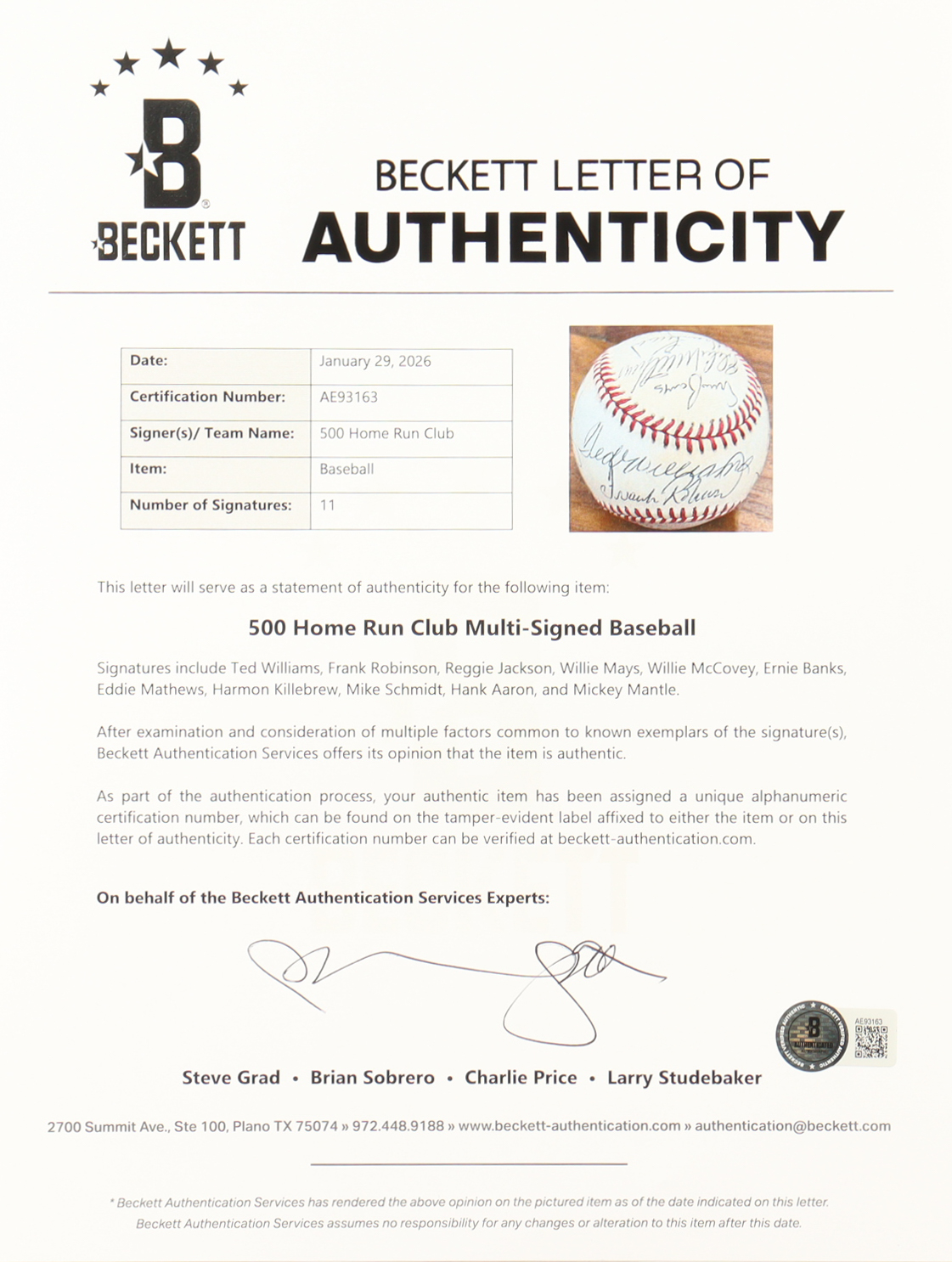 Mickey Mantle, Ted Williams, Willie Mays, Hank Aaron, Reggie Jackson, 500 Home Run Club OAL Baseball Signed By (11) (Beckett)