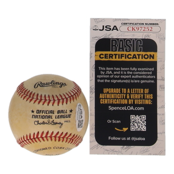 Rawlings Official National League Baseball. Hand-signed by Johnny Mize (D. 1993, New York Giants, HOF). Please see photos for more details regarding the condition of the item as the baseball is naturally toned.