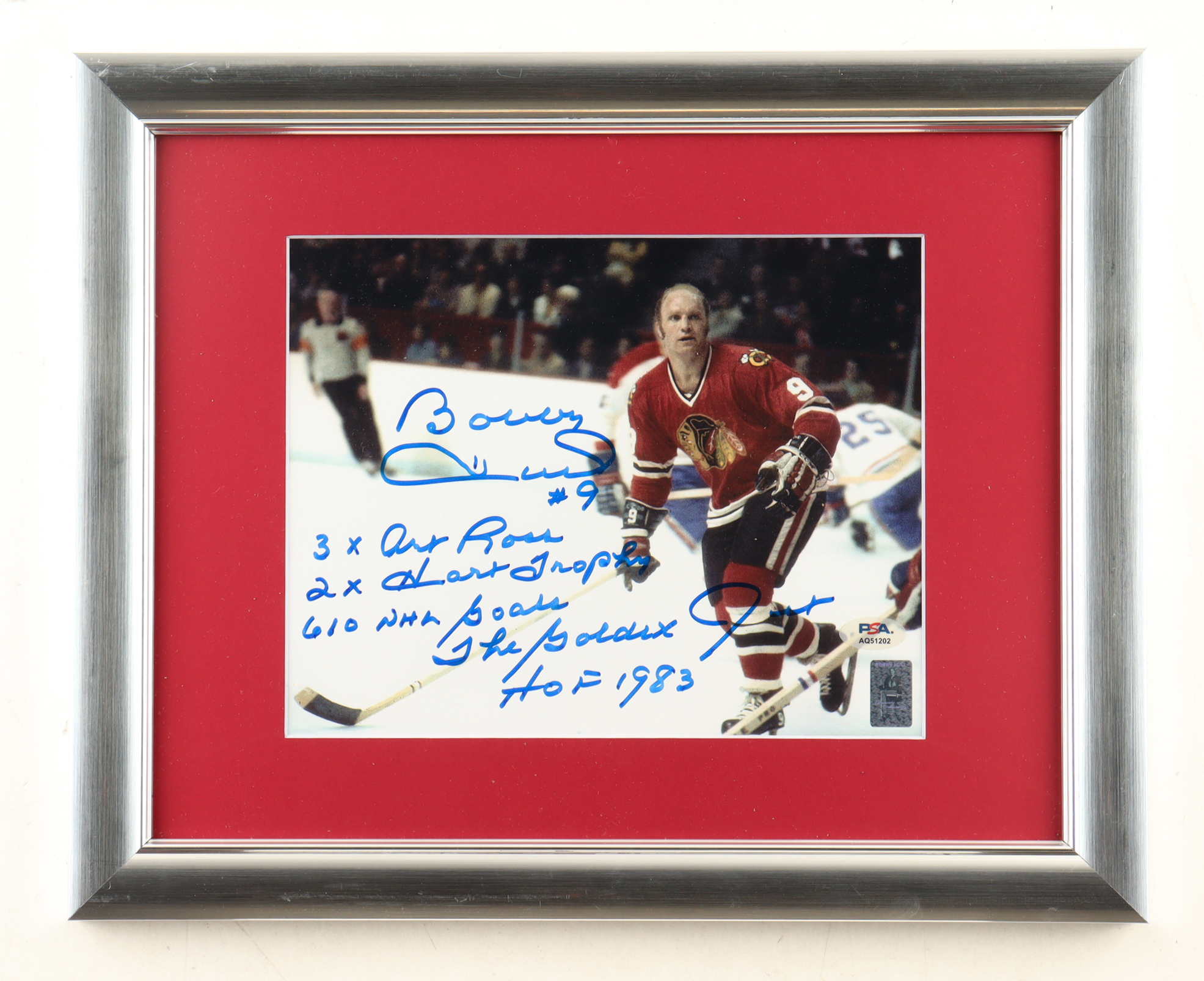 Custom frame measures 13" x 16" in size and features a photo that has been hand-signed and inscribed by Bobby Hull (Chicago Blackhawks, HOF).