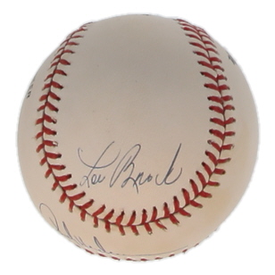 Rawlings Official National League Baseball. Hand-signed by Ricky Henderson (D. 2024, Oakland Athletics, HOF) and Lou Brock (D. 2020, St. Louis Cardinals, HOF). Please see photos for more details regarding the condition of the item as the baseball shows signs of natural toning.