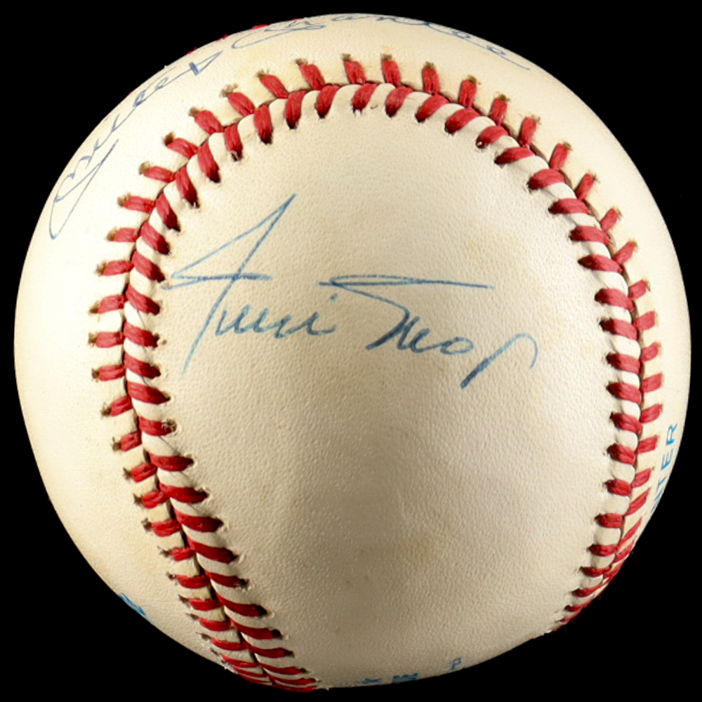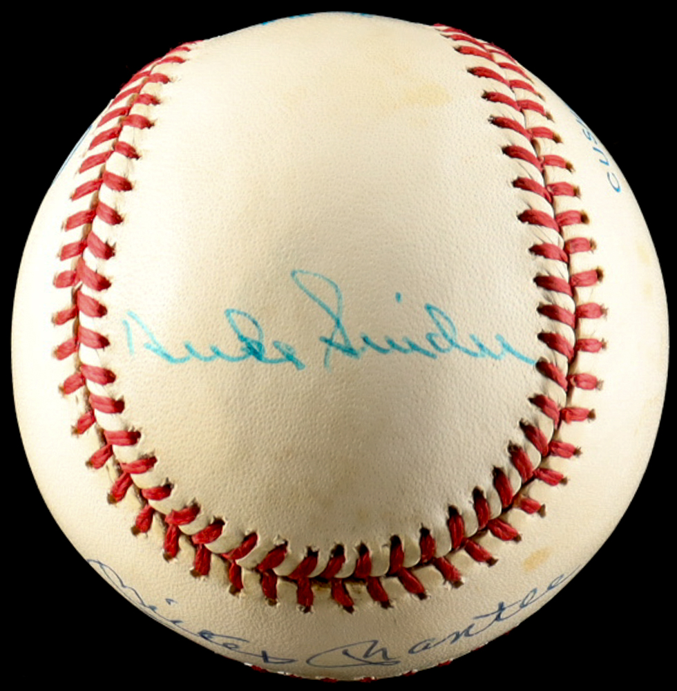 Rawlings Official American League baseball. Hand-signed by Mickey Mantle (D. 1995, New York Yankees, HOF), Willie Mays (San Francisco Giants, HOF) and Duke Snider (D. 2011, Brooklyn Dodgers, HOF).