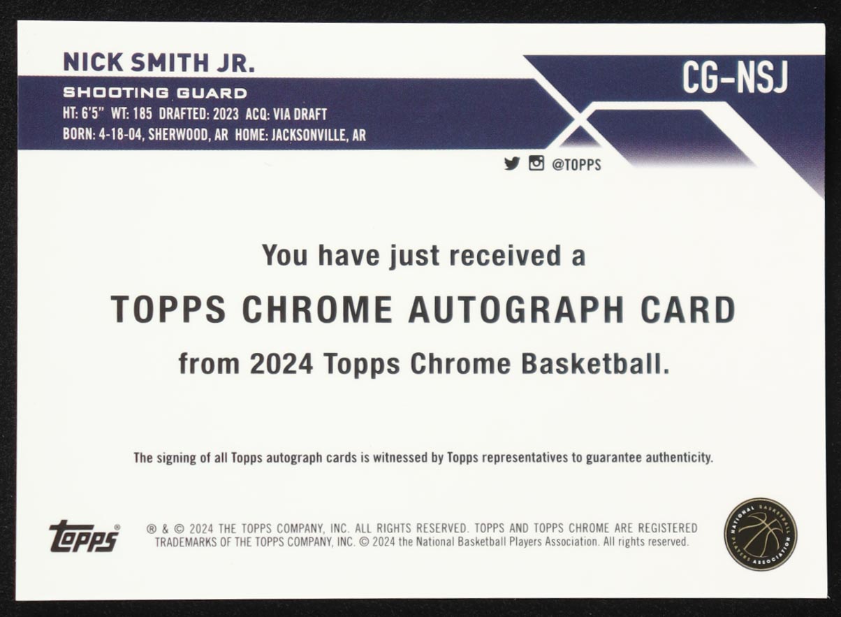Nick Smith Jr. 2023-24 Topps Chrome Sapphire Autographs Gold Refractors #CGNSJ #10/50 RC