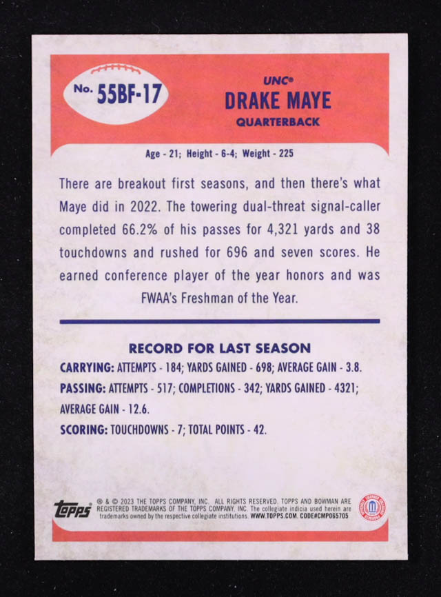 Drake Maye 2023 Bowman Chrome University '55 Bowman #55BF17