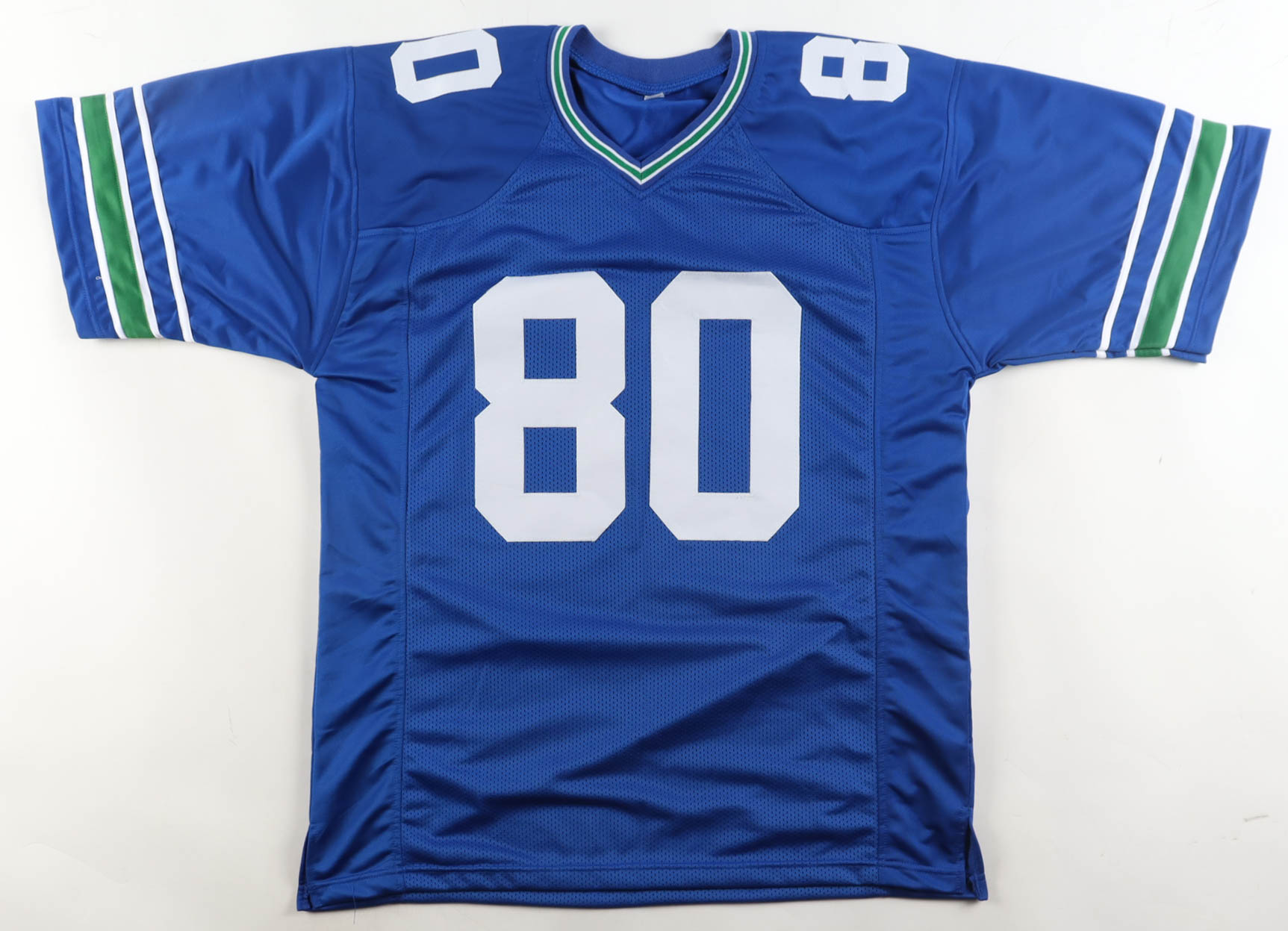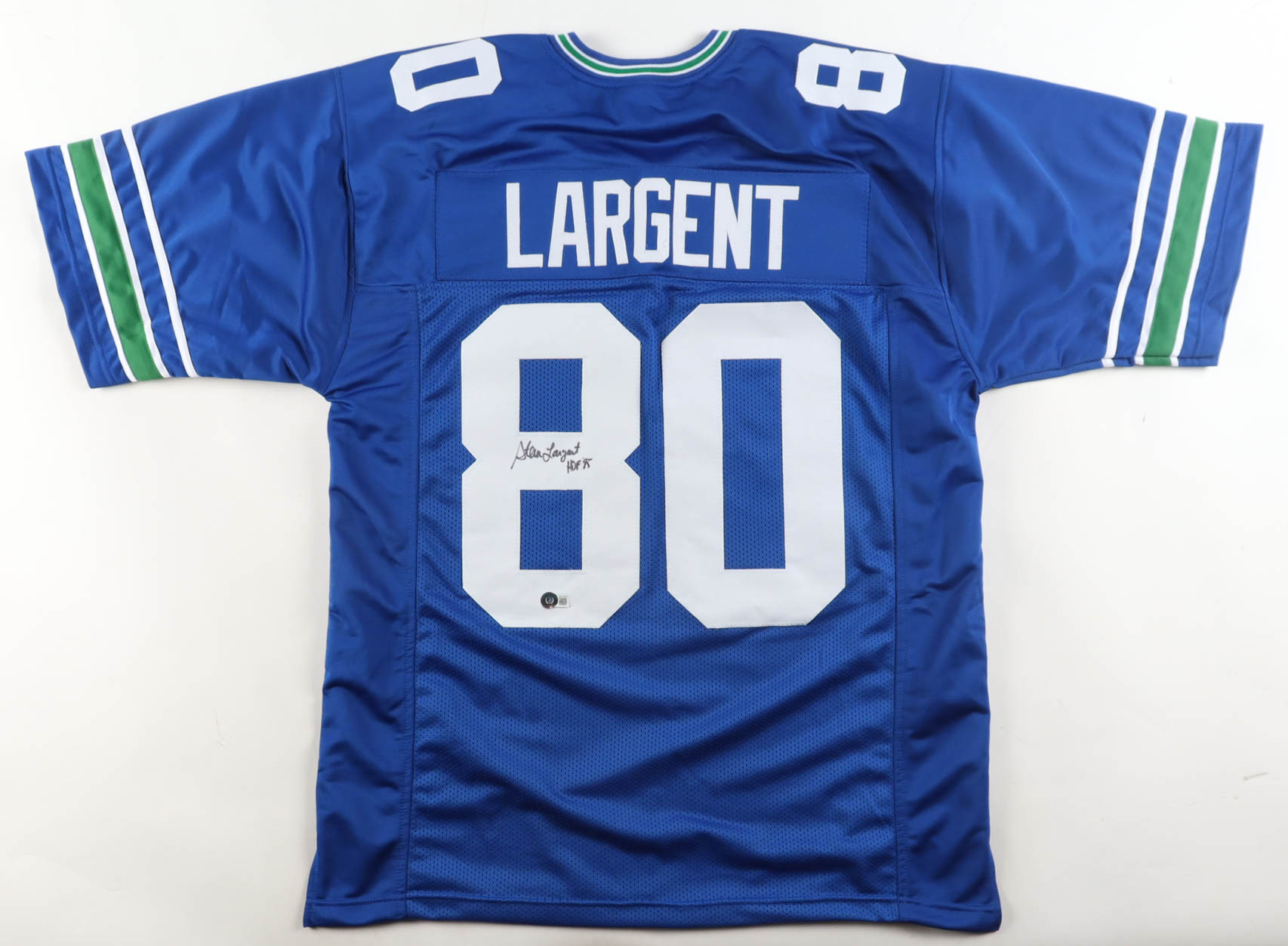 Custom jersey with everything sewn on, size XL. Hand-signed and inscribed by Steve Largent (Seattle Seahawks, HOF).