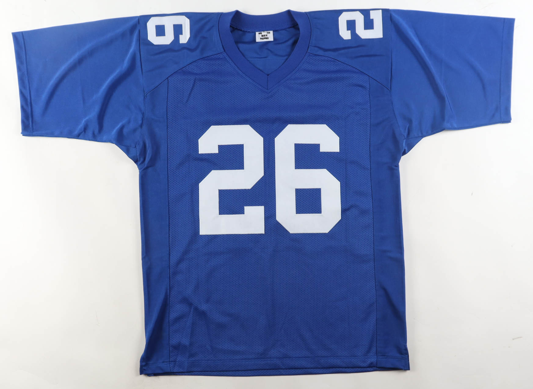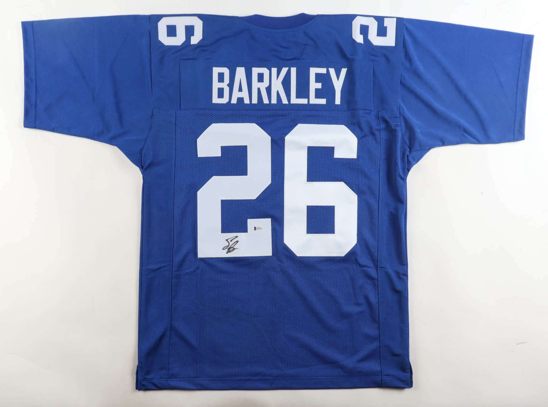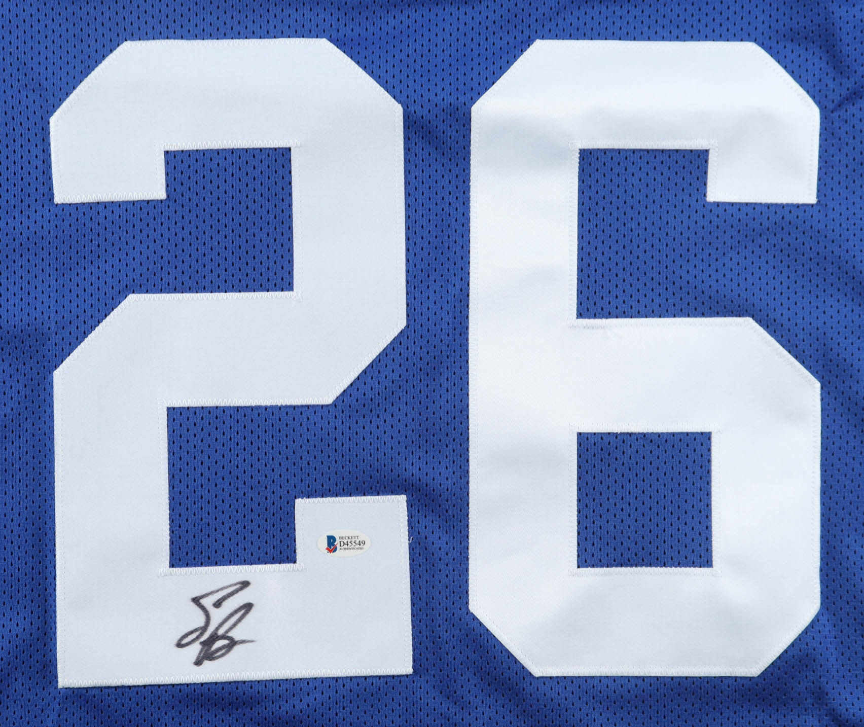 Custom jersey with everything sewn on, size XL. Hand-signed by Saquon Barkley.
