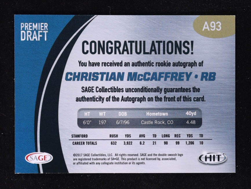 Christian McCaffrey 2017 SAGE HIT Premier Draft Autographs #A93 RC