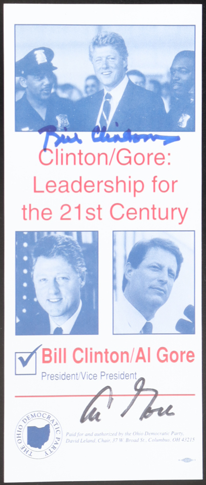 Pamphlet measures 3.75" x 9" in size and has been hand-signed by Bill Clinton and Al Gore.