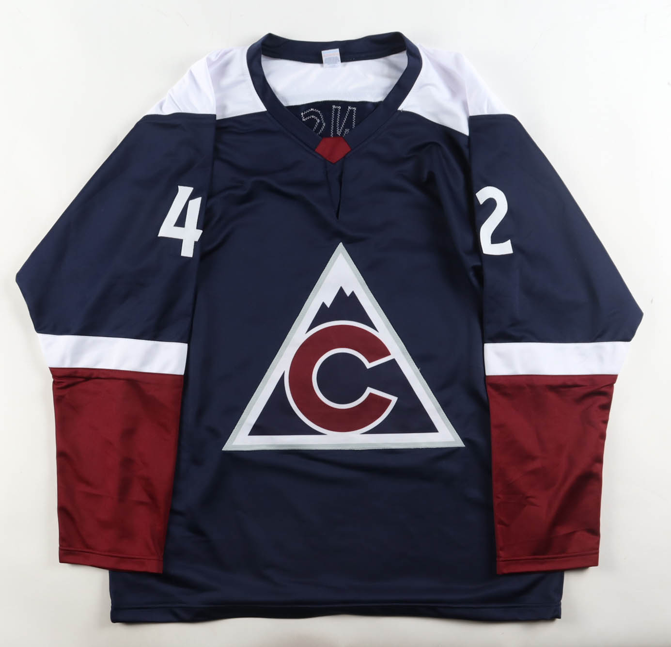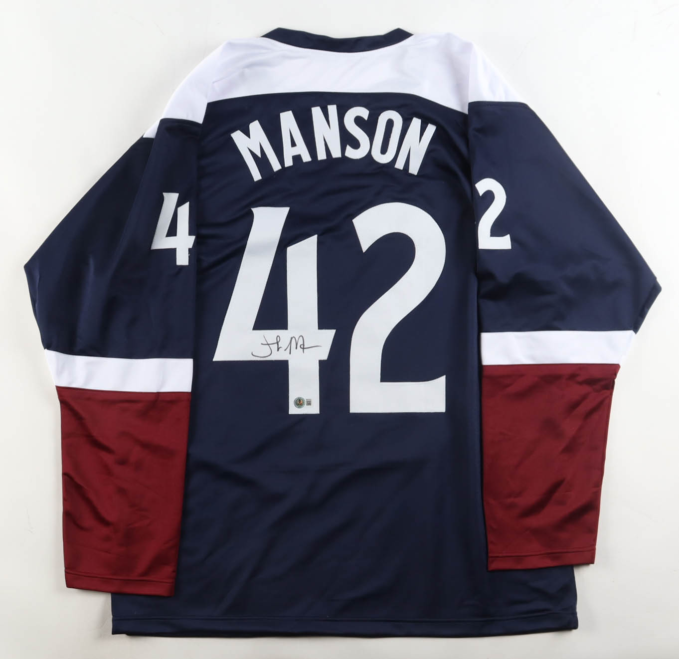 Custom jersey with everything sewn on, size XL. Hand-signed by Josh Manson (Colorado Avalanche).