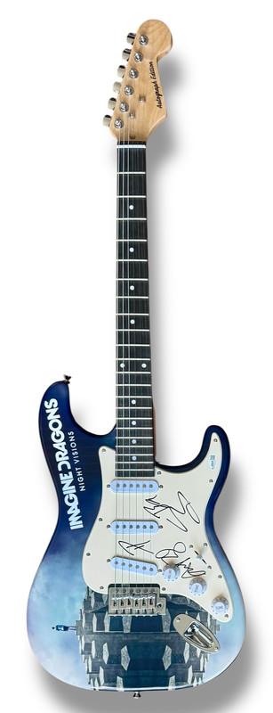 Custom Autograph Edition Stratocaster style electric guitar measures approximately 39" in length and has been hand-signed on the pickguard by Dan Reynolds (lead singer), Wayne Sermon (Lead Guitarist), Ben McKee (bassist), and Daniel Platzman (Drummer) .