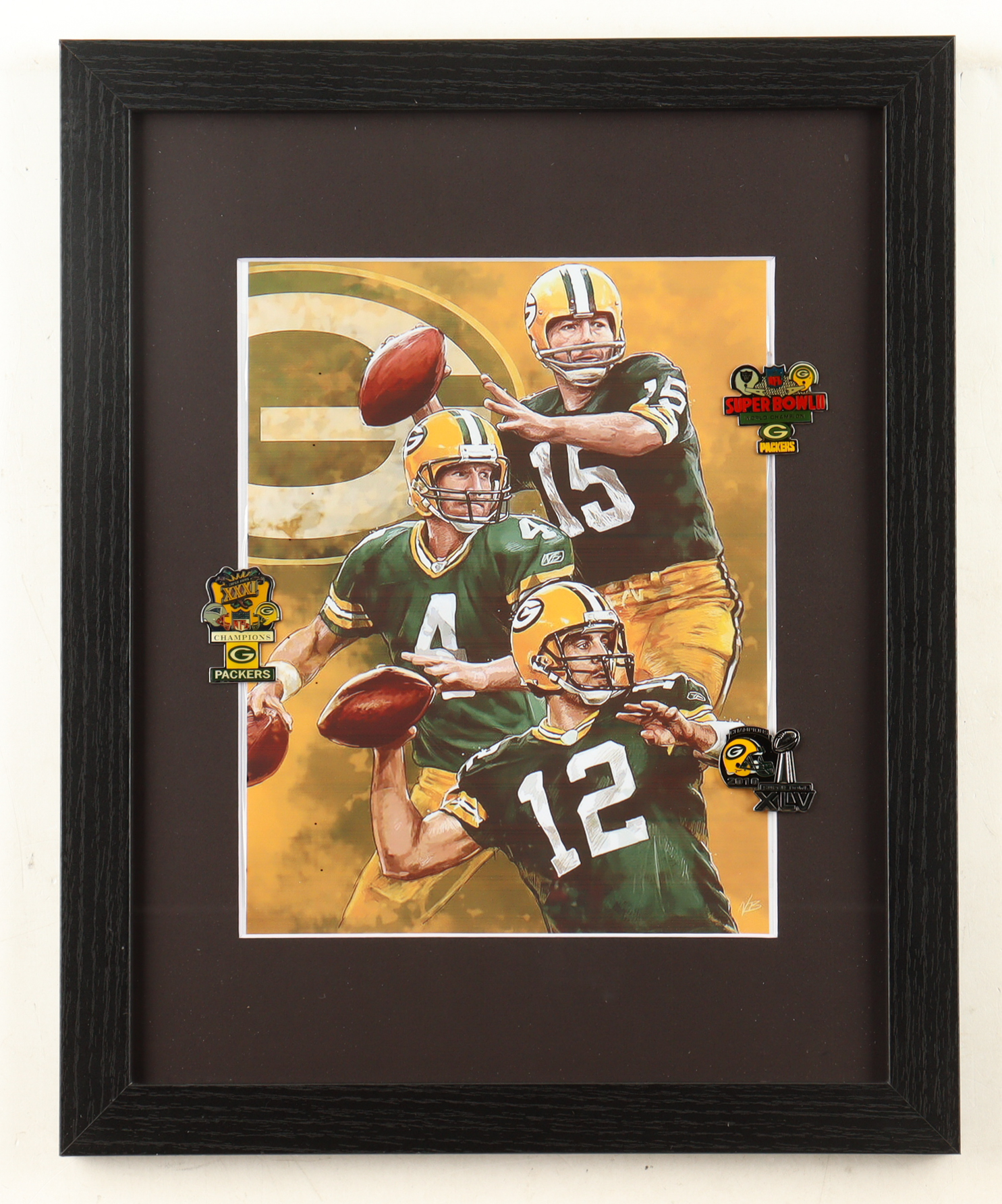 Custom frame measures 13" x 16" in size and features an art print depicting the Green Bay Packers Greatest Quarterbacks including Bart Starr, Brett Favre, and Aaron Rodgers. Note that the item is unsigned. Display also includes (3) Super Bowl II, XXXI, and XLV pins.