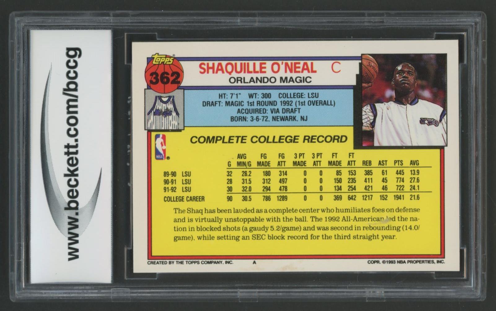 Shaquille O'Neal 1992-93 Topps #362 (BCCG 9)