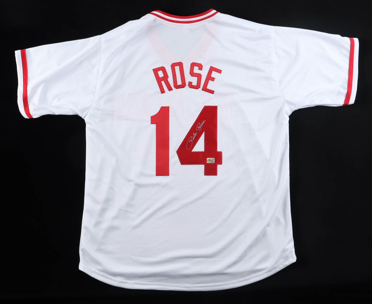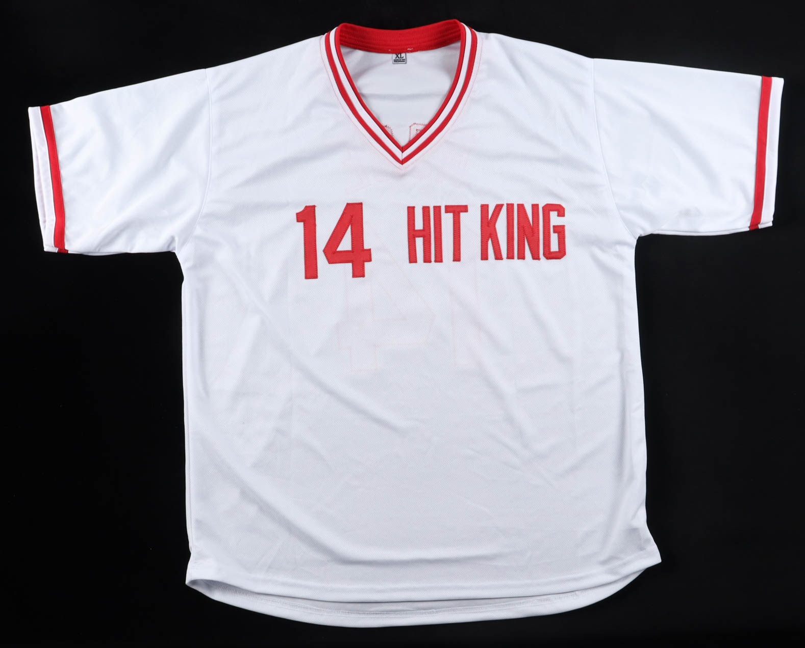 Custom jersey with everything sewn on, size XL. Hand-signed by Pete Rose (D. 2024).