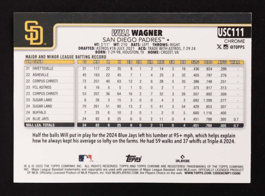 Will Wagner 2025 Topps Chrome Update Sapphire #USC111 RC #101/150