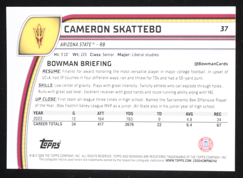 Cam Skattebo 2024 Bowman Chrome University Blue Mini Diamond Refractors #37 #110/175 RC