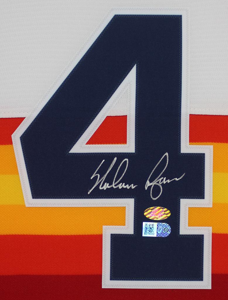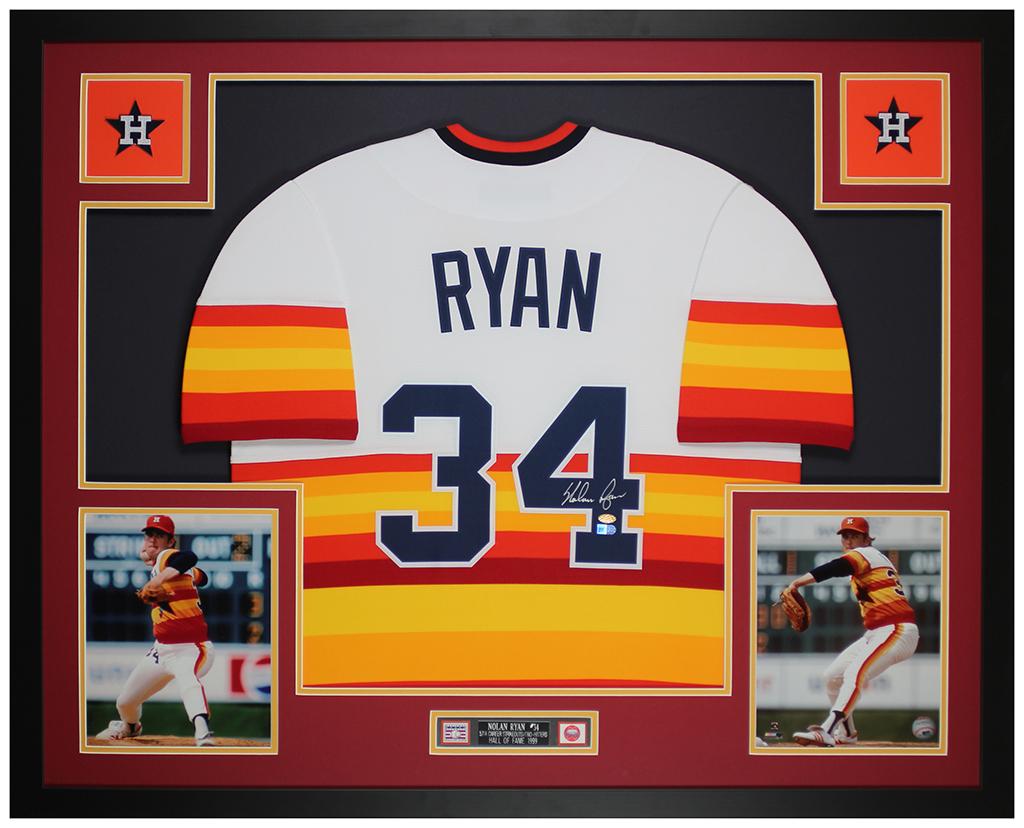 Custom frame measures 35" x 43" in size and features a jersey hand-signed by Nolan Ryan (HOF).