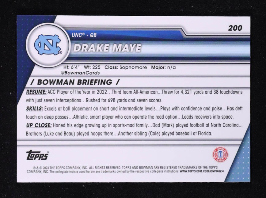 Drake Maye 2023 Bowman Chrome Sapphire University #200 RC