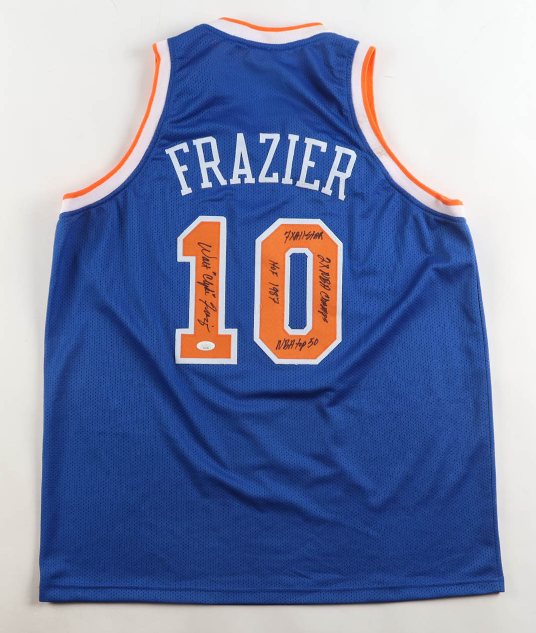 Walt "Clyde" Frazier Signed Jersey Inscribed "NBA Top 50", "7x All-Star", "2x NBA Champ", & "HOF 1987" (JSA)