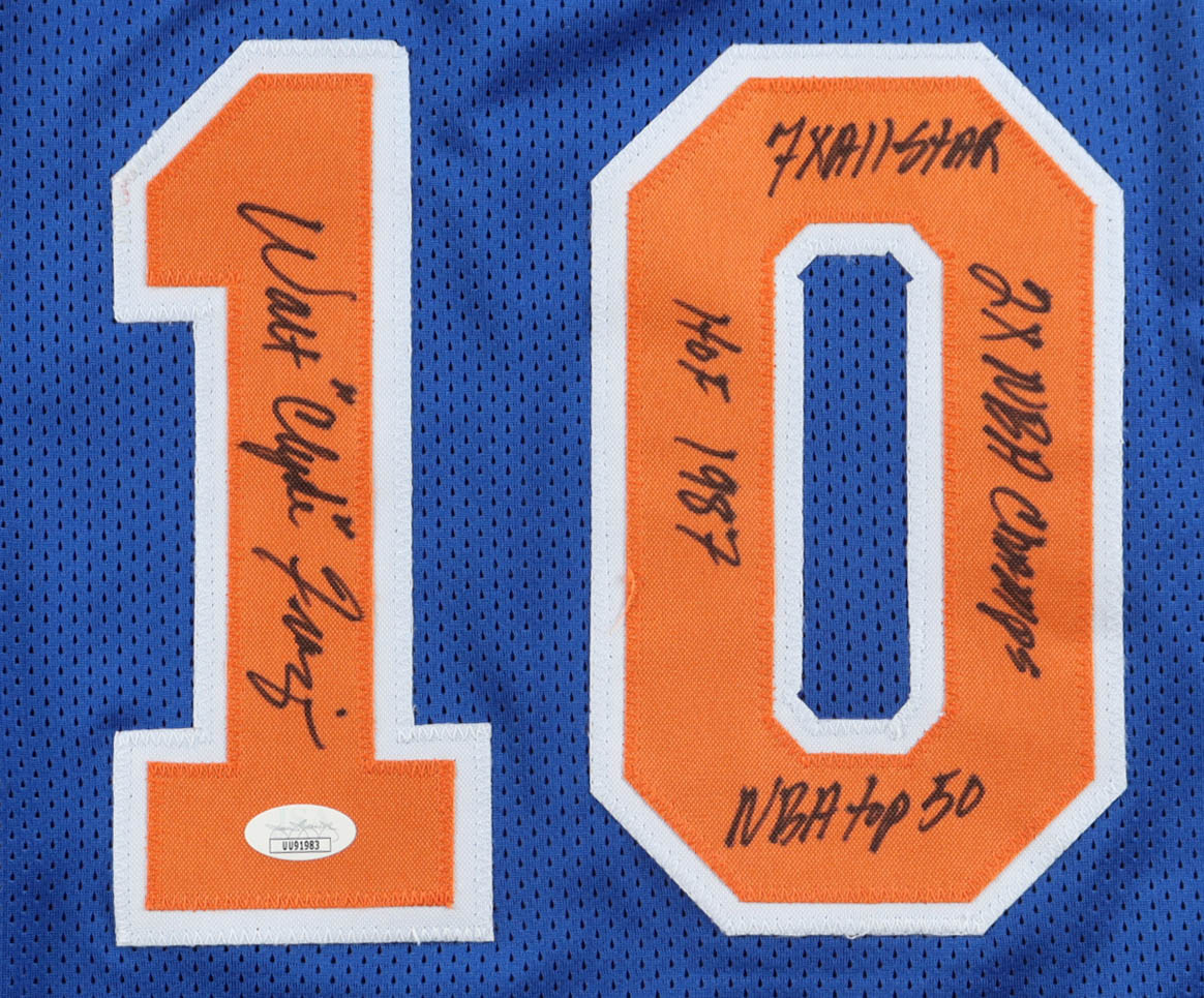 Custom jersey with everything sewn on, size XL. Hand-signed and inscribed by Walt "Clyde" Frazier (HOF).