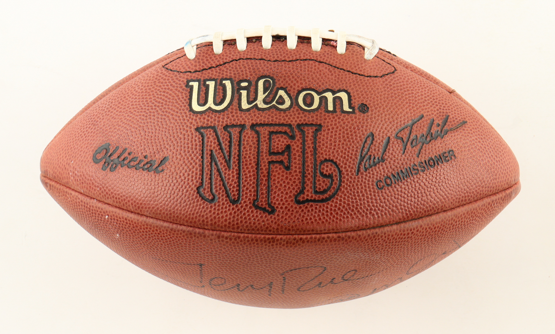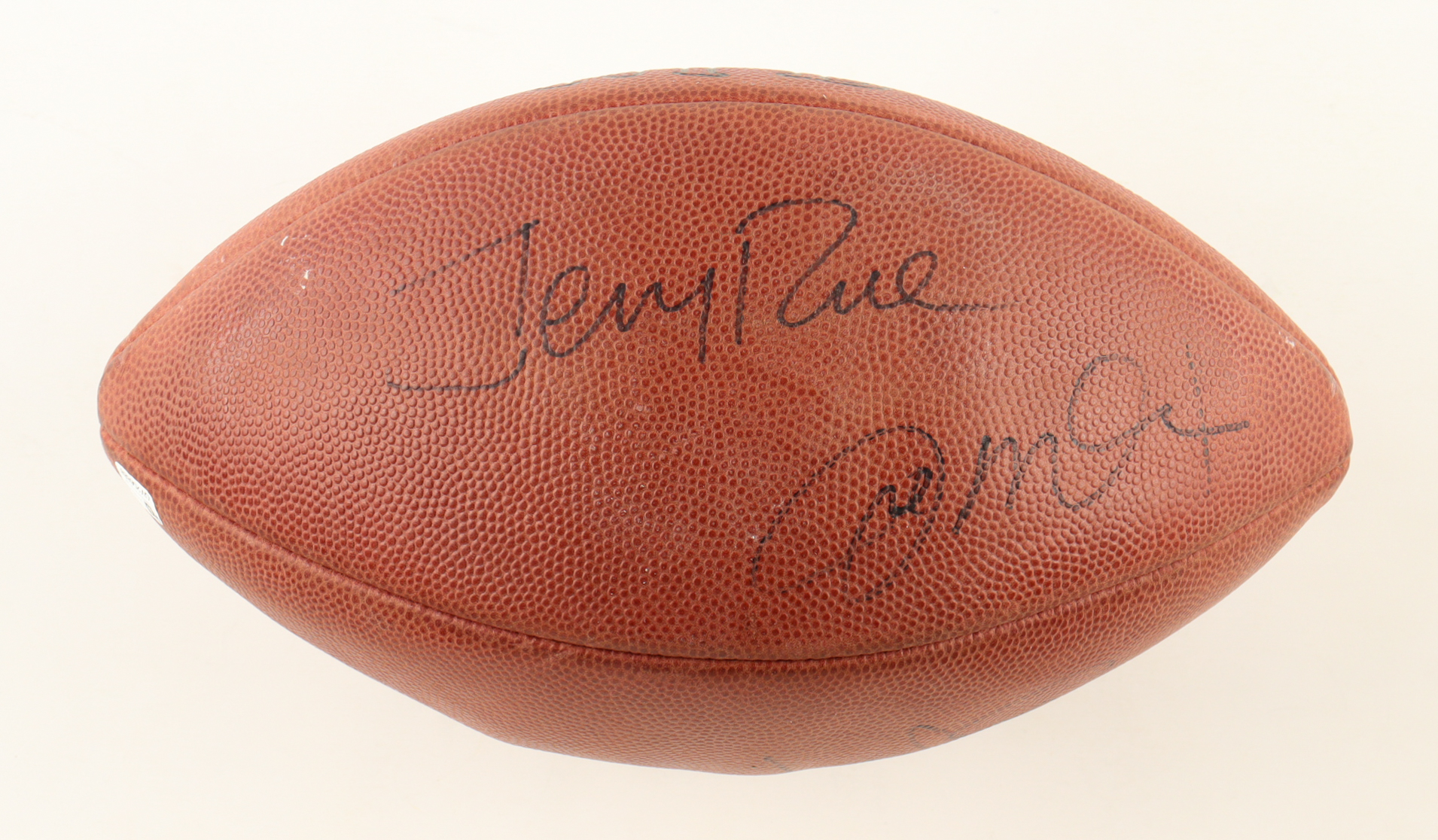Wilson Official NFL football has been hand-signed by Joe Montana, Steve Young, and Jerry Rice (San Francisco 49ers).