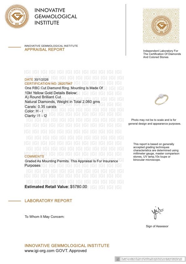 This piece includes paperwork from the Innovative Gemological Institute (IGI).