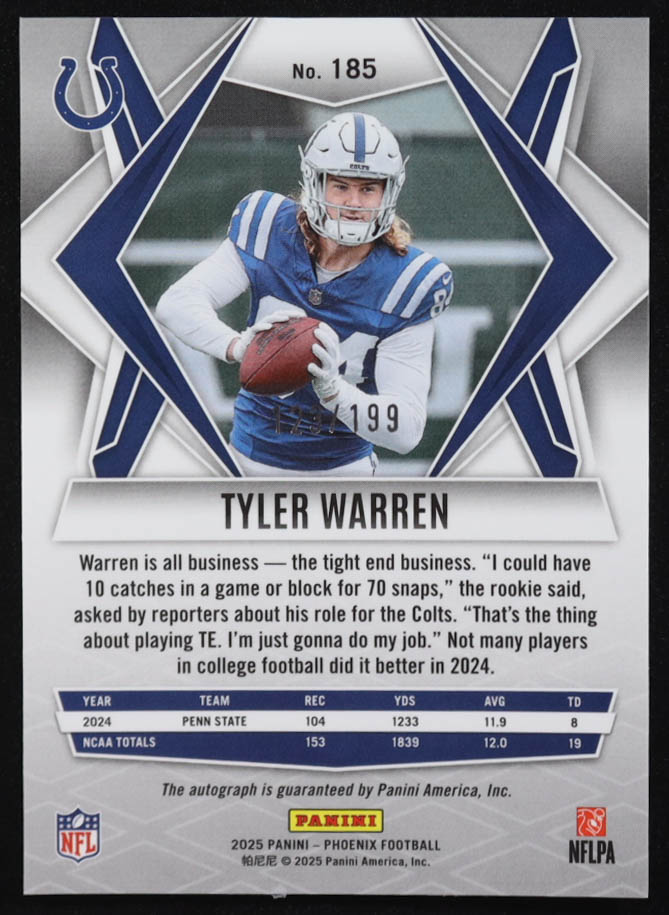 Tyler Warren 2025 Panini Phoenix Rookie Autographs Silver #185 RC #123/199