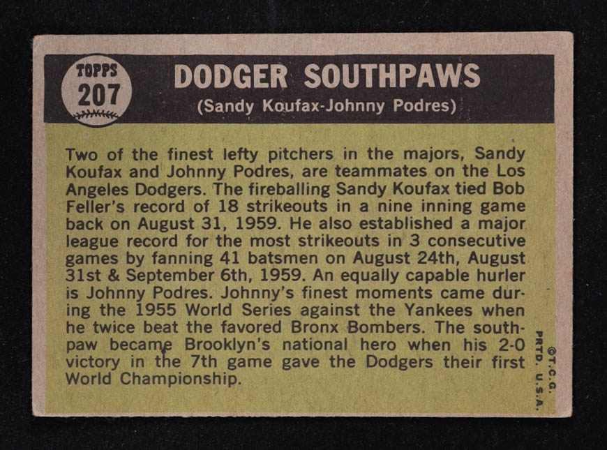 Sandy Koufax / Johnny Podres 1961 Topps #207 Dodger Southpaws