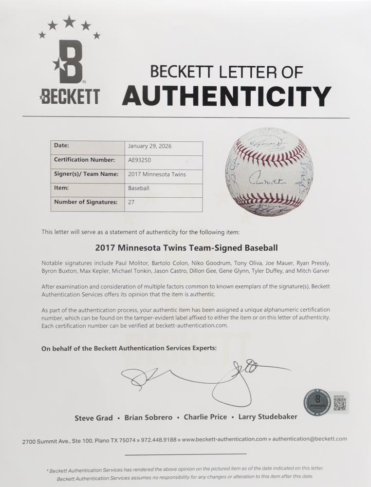2017 Twins | OAL Baseball Team-Signed by (27) with Bartolo Colon, Paul Molitor, Byron Buxton (Beckett)