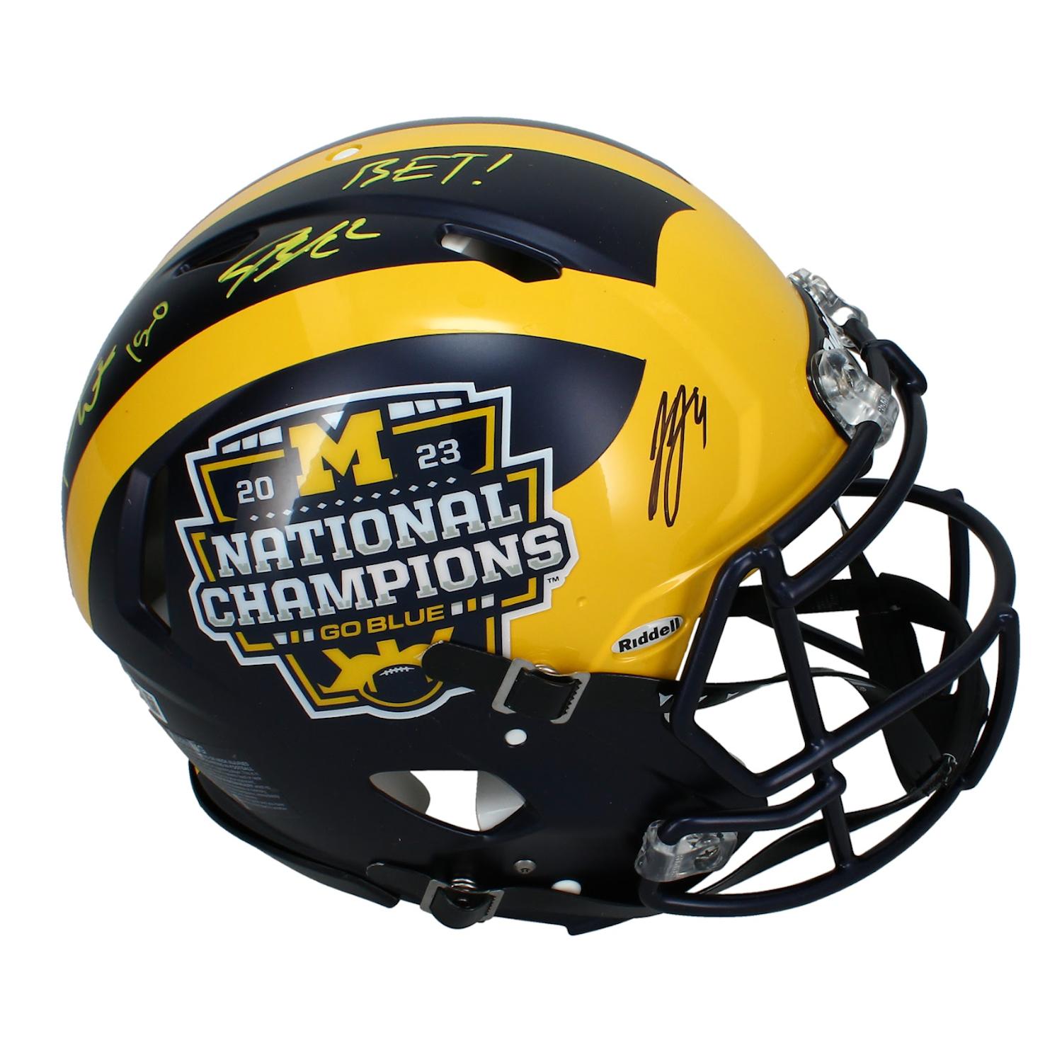JJ McCarthy, Blake Corum & Roman Wilson Signed Michigan Wolverines 2023 National Champions Logo Full-Size Authentic On-Field Speed Helmet Inscribed "15-0 BET!" (Beckett)