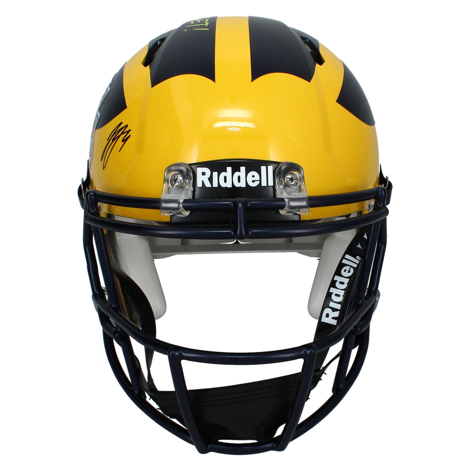 Riddell Michigan Wolverines 2023 National Champions Logo full-size authentic on-field speed helmet has been hand-signed by JJ McCarthy, Blake Corum, and Roman Wilson.