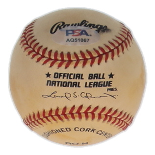 Rawlings Official National League Baseball. Hand-signed by Richie Ashburn (D. 1997, Philadelphia Phillies, HOF). Please note, the baseball is naturally toned, and there is staining throughout.