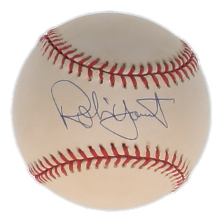 Rawlings Official American League baseball. Has been hand-signed by Robin Yount (Milwaukee Brewers, HOF). Please note, ball has been stained and naturally toned.