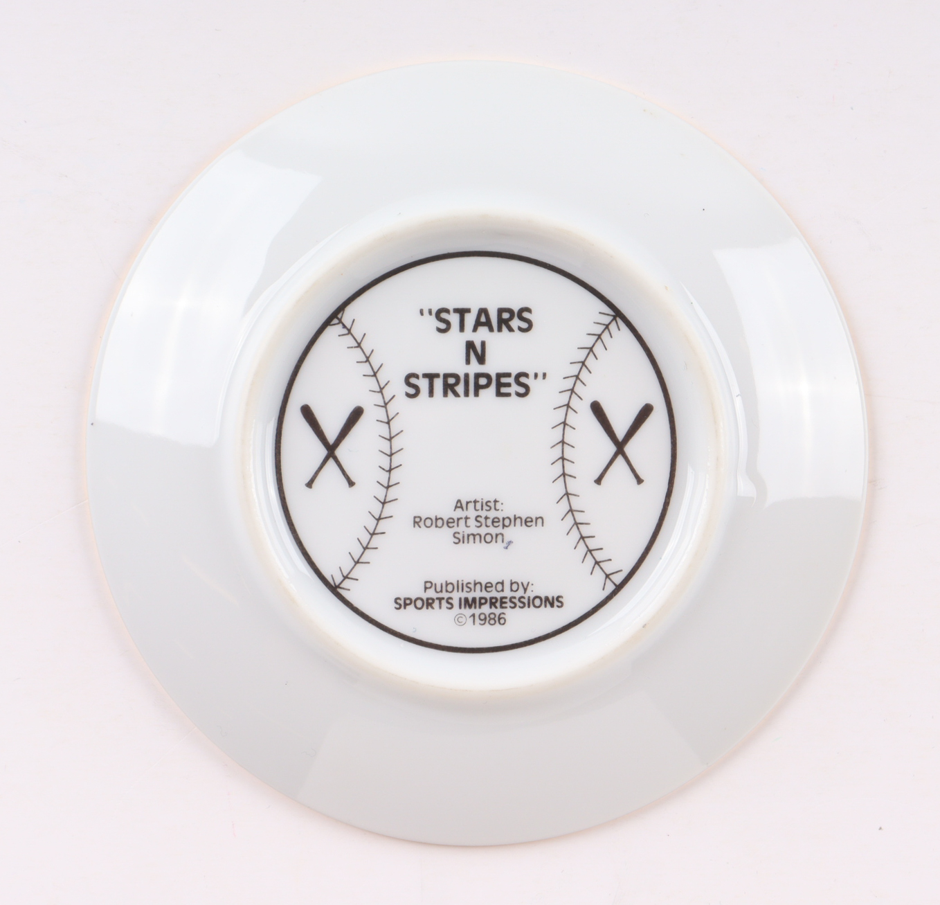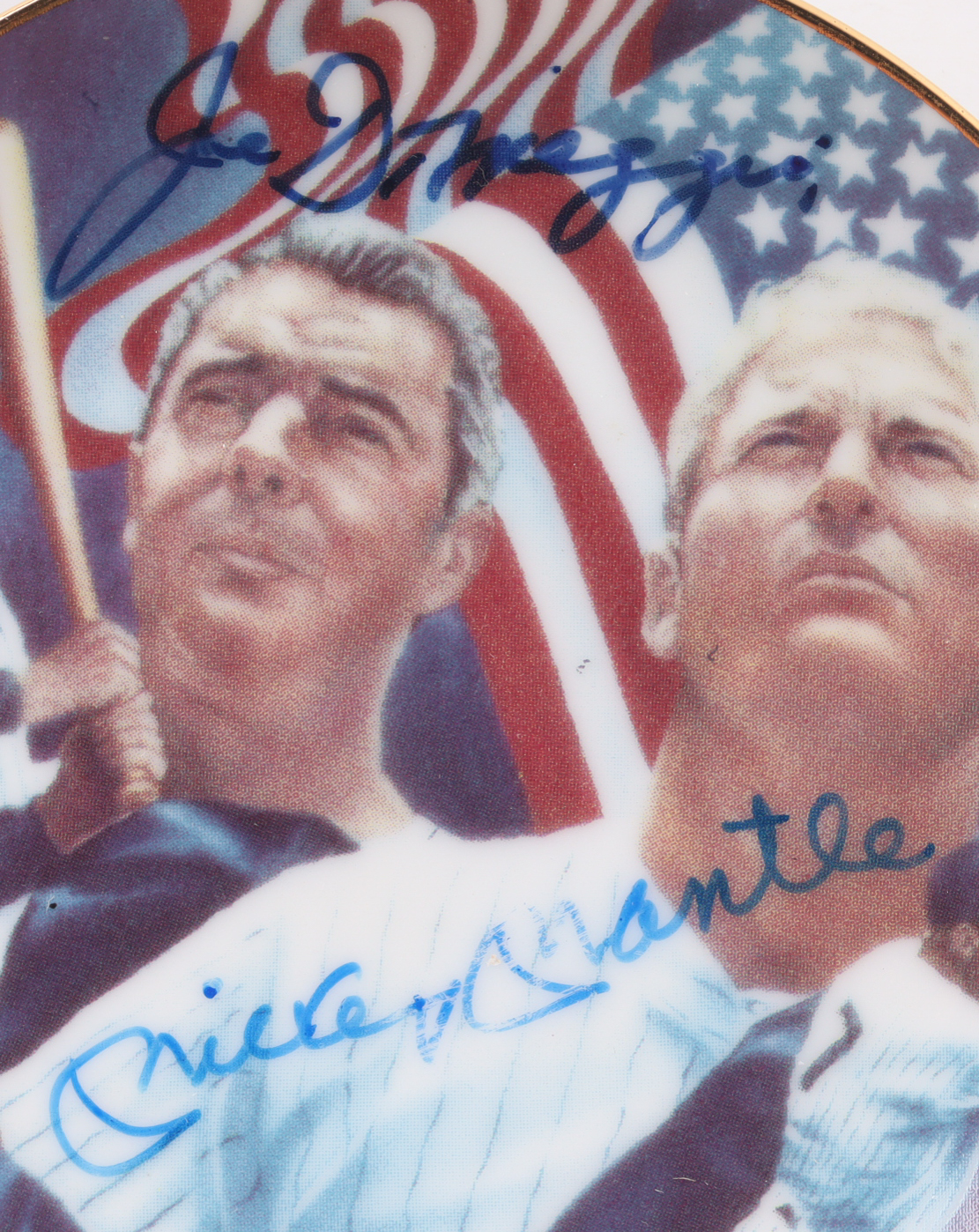 1986 Sports Impressions Ceramic plate measures 4" in diameter and features a Commemorative art print plate has been hand-signed by Joe DiMaggio (D. 1999, New York Yankees, HOF) and Mickey Mantle (D. 1995, New York Yankees, HOF). Please note the Mantle signature is fading, see photos for more details.
