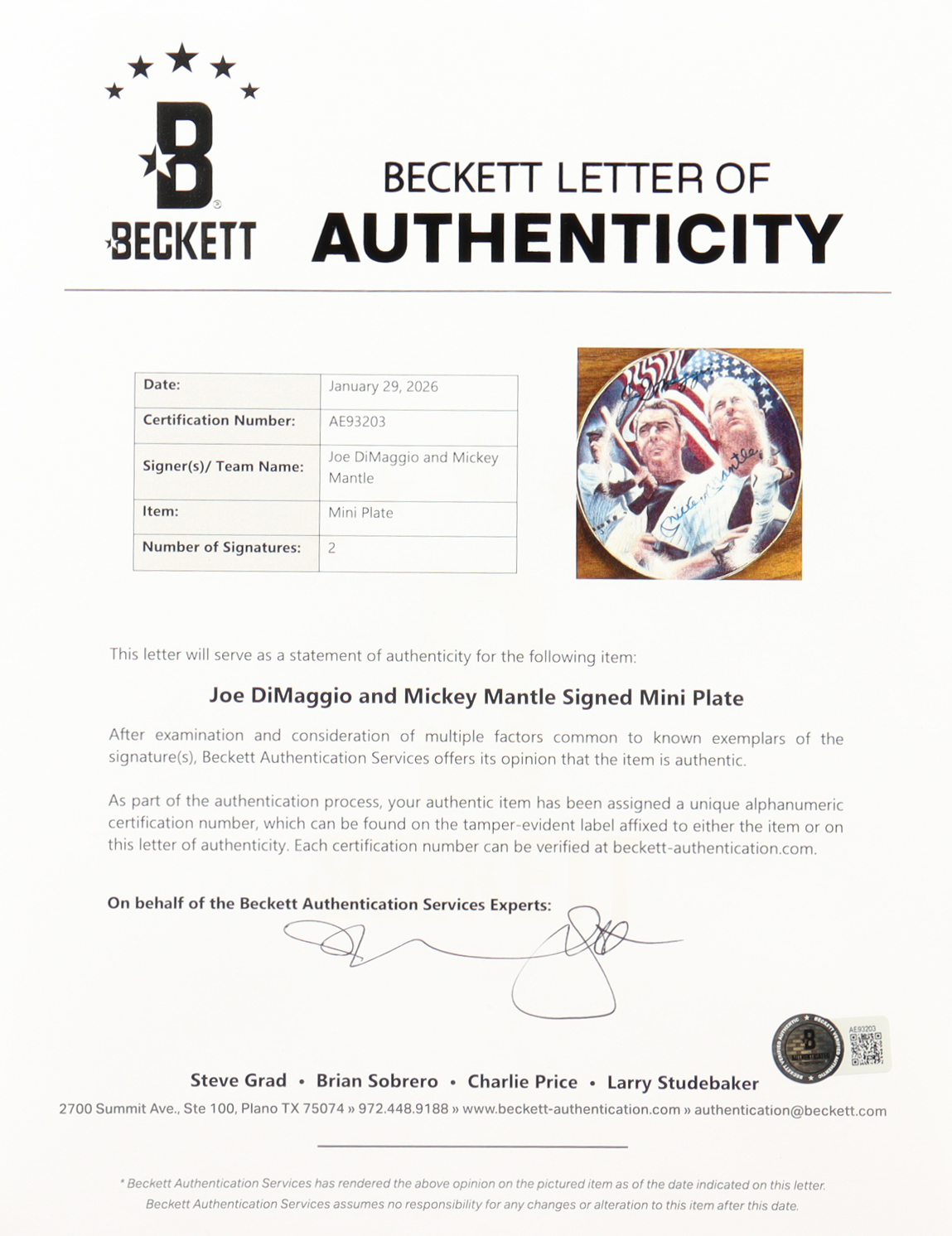 The autograph includes an official Beckett Authentication Services hologram and matching LOA for authenticity purposes.