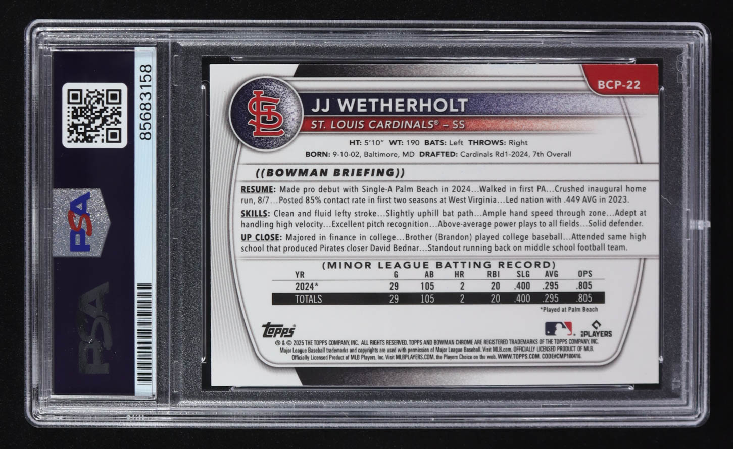 JJ Wetherholt Signed 2025 Bowman Chrome Prospects #BCP22 (PSA Encapsulated)