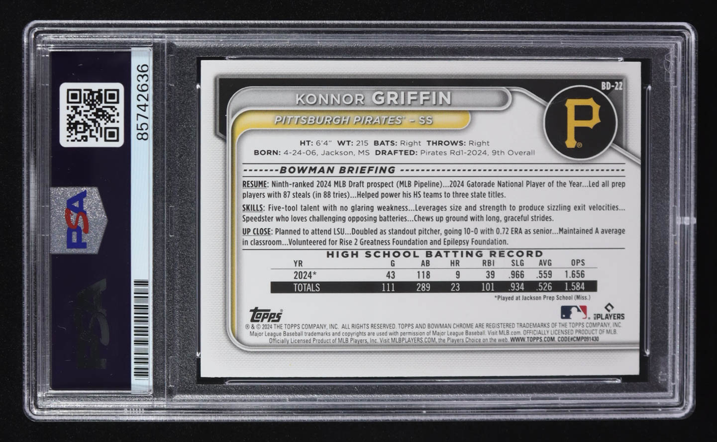 Konnor Griffin Signed 2024 Bowman Draft #BD22 (PSA Encapsulated)