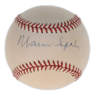 Rawlings Official National League Baseball. Hand-signed by Warren Spahn (D. 2003, Milwaukee Braves, HOF). Please note, ball has been naturally stained toned. Refer to photos regarding the condition of the item.