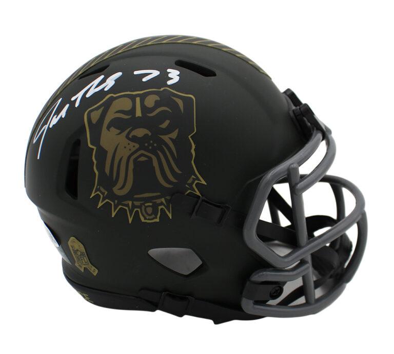Riddell Cleveland Browns salute to service alternate speed mini helmet. Hand-signed by Joe Thomas (HOF).