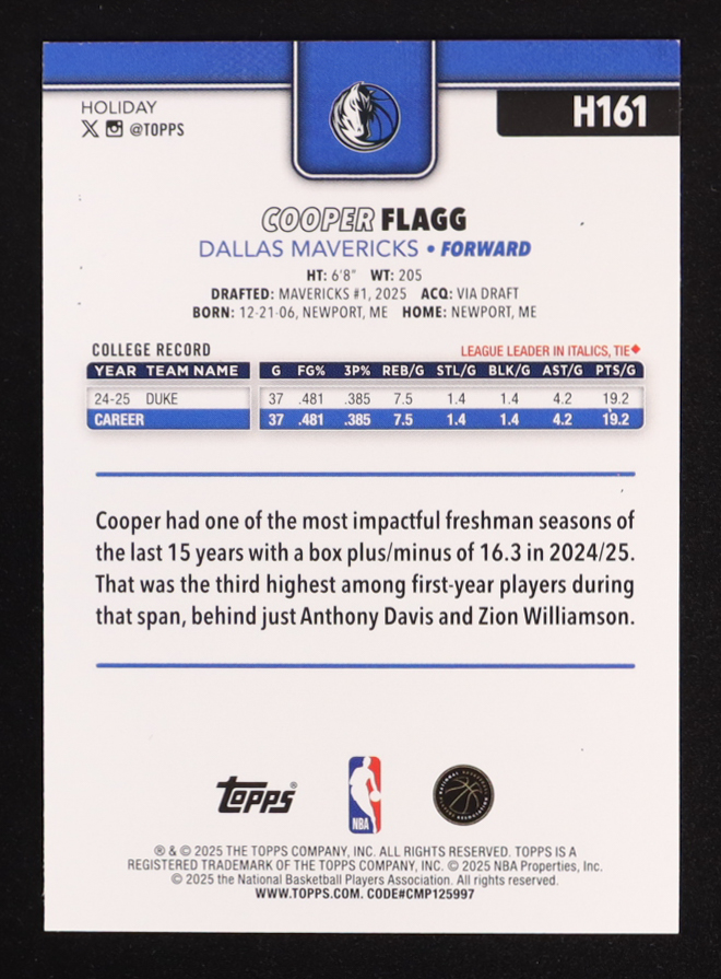 Cooper Flagg 2025-26 Topps Holiday #H161 RC