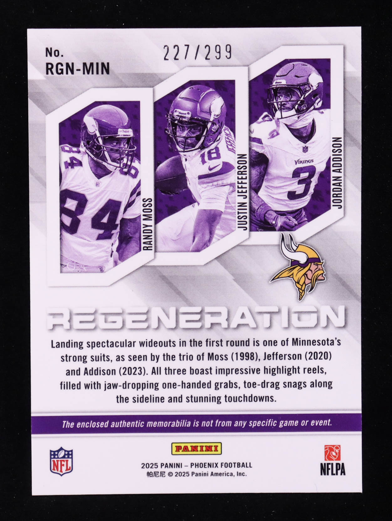Randy Moss / Jordan Addison / Justin Jefferson 2025 Panini Phoenix Regeneration Jerseys #7 #227/299