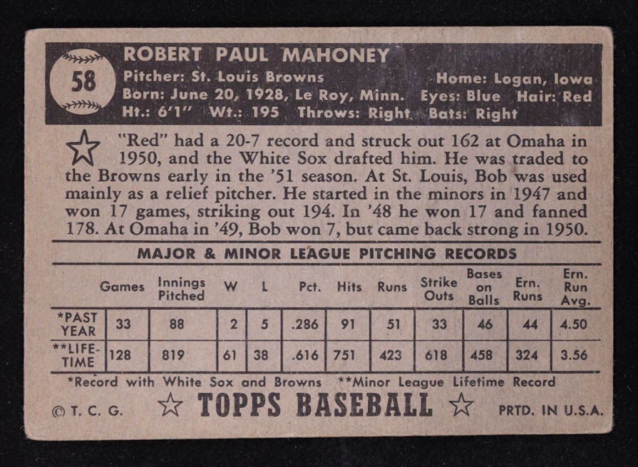 Bob Mahoney 1952 Topps #58 RC