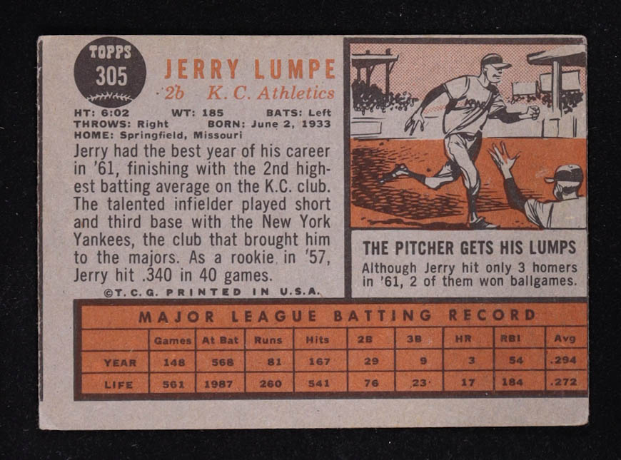 Please see photos for more details regarding the condition of the card. Please note that the back of the card is 1962 Topps #305 Jerry Lumpe.