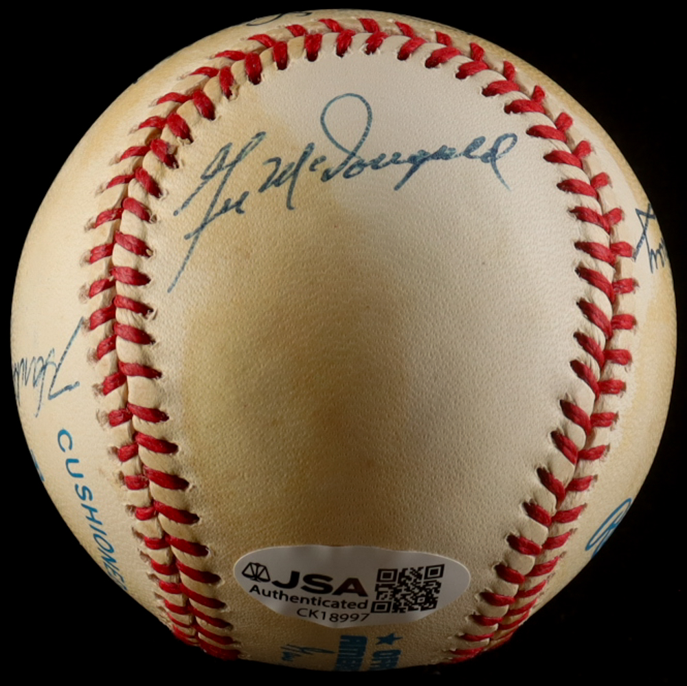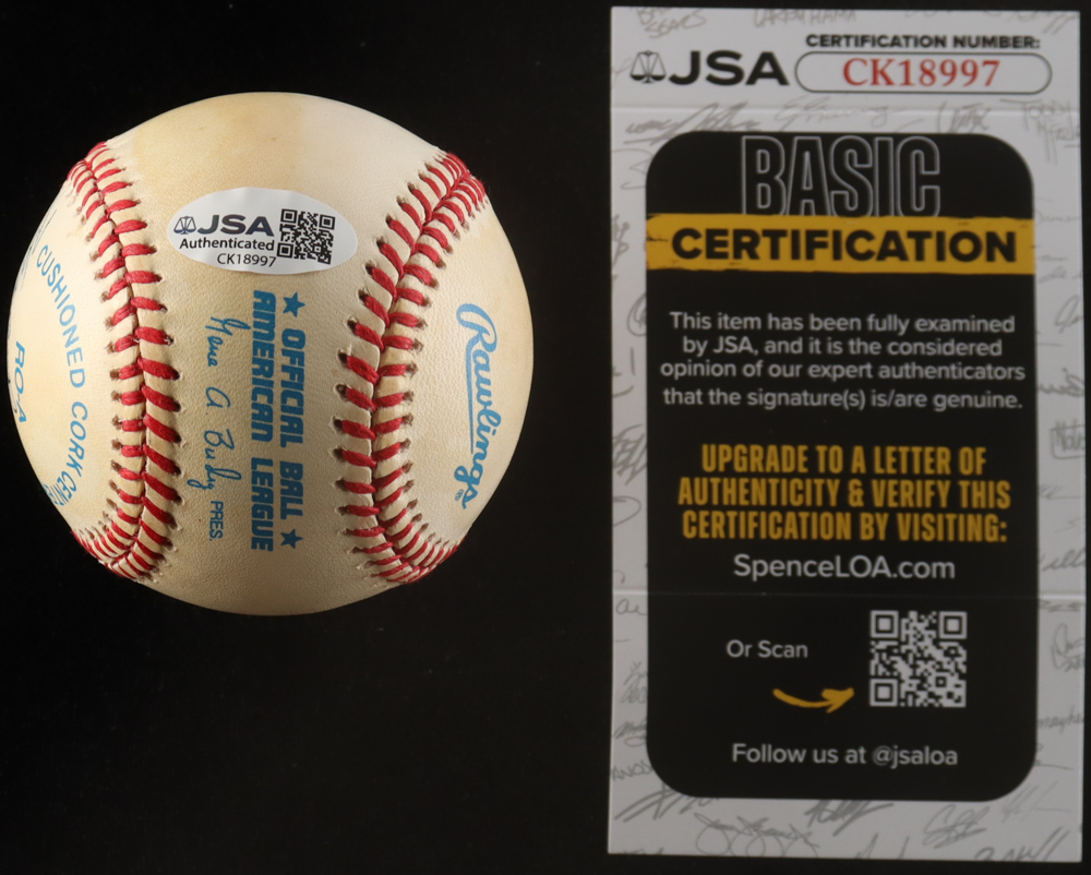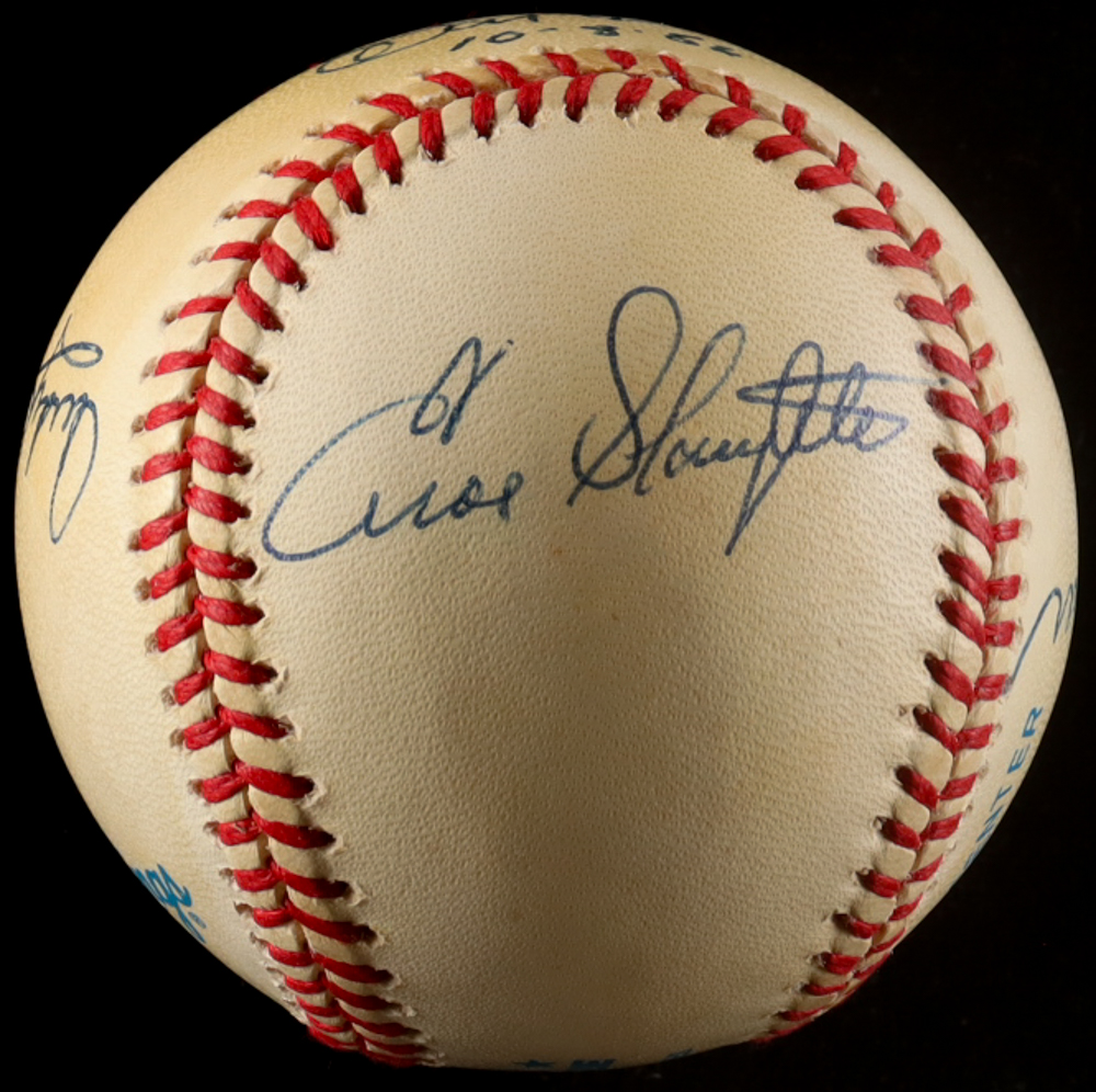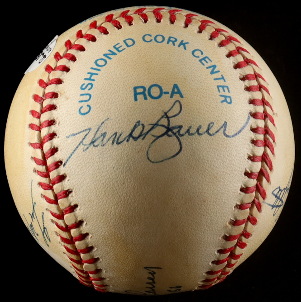 Rawlings Official American League baseball. Hand-signed and inscribed by Don Larsen (D. 2020), Hank Bauer (D. 2007), Enos Slaughter (D. 2002, HOF), Gil McDougald (D. 2010), and Andy Carey (D. 2011). (New York Yankees)