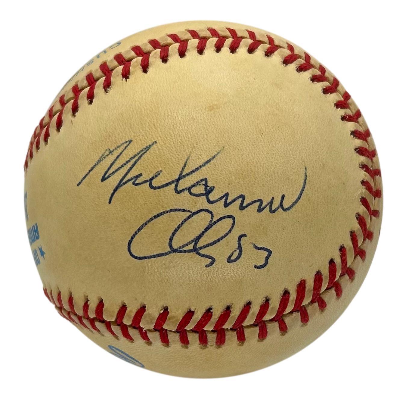 Rawlings Official American League Baseball. Hand-signed twice by Muhammad Ali (D.2016, HOF). Please note, the baseball is naturally toning.