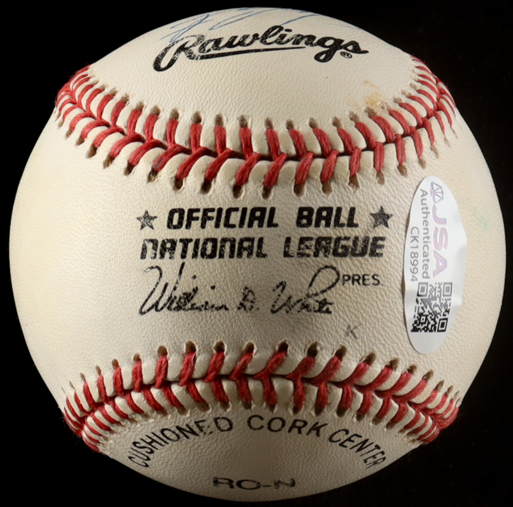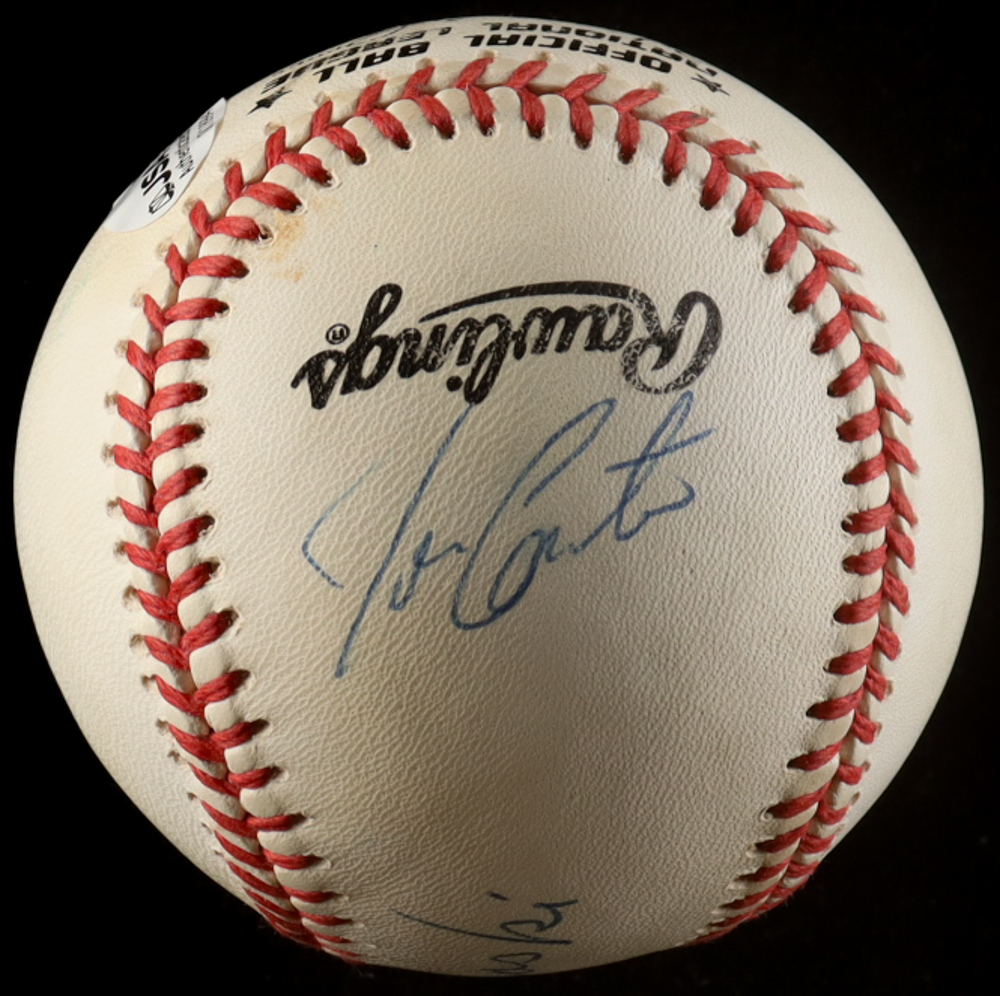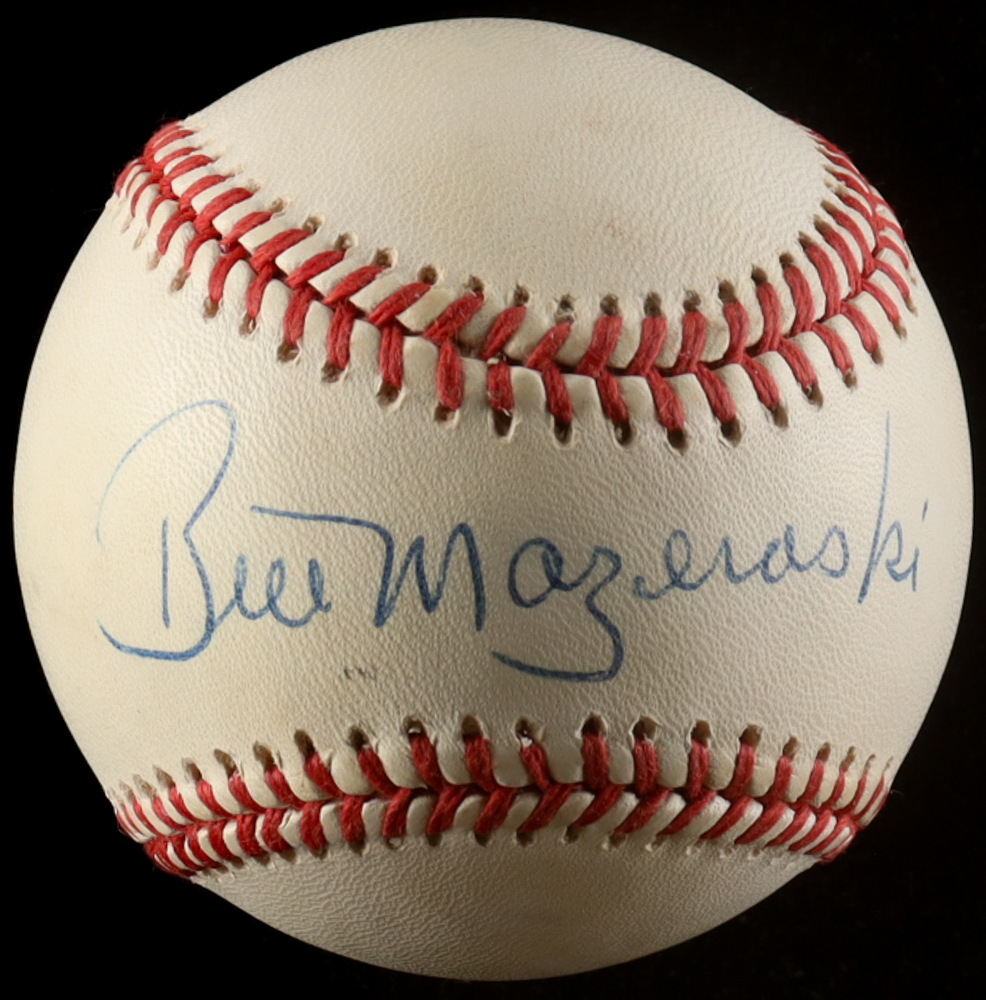 Official National League Baseball has been signed by Bill Mazeroski (Pittsburgh Pirates, HOF) and Joe Carter (Toronto Blue Jays). Please note, the ball is stained and naturally toned.
