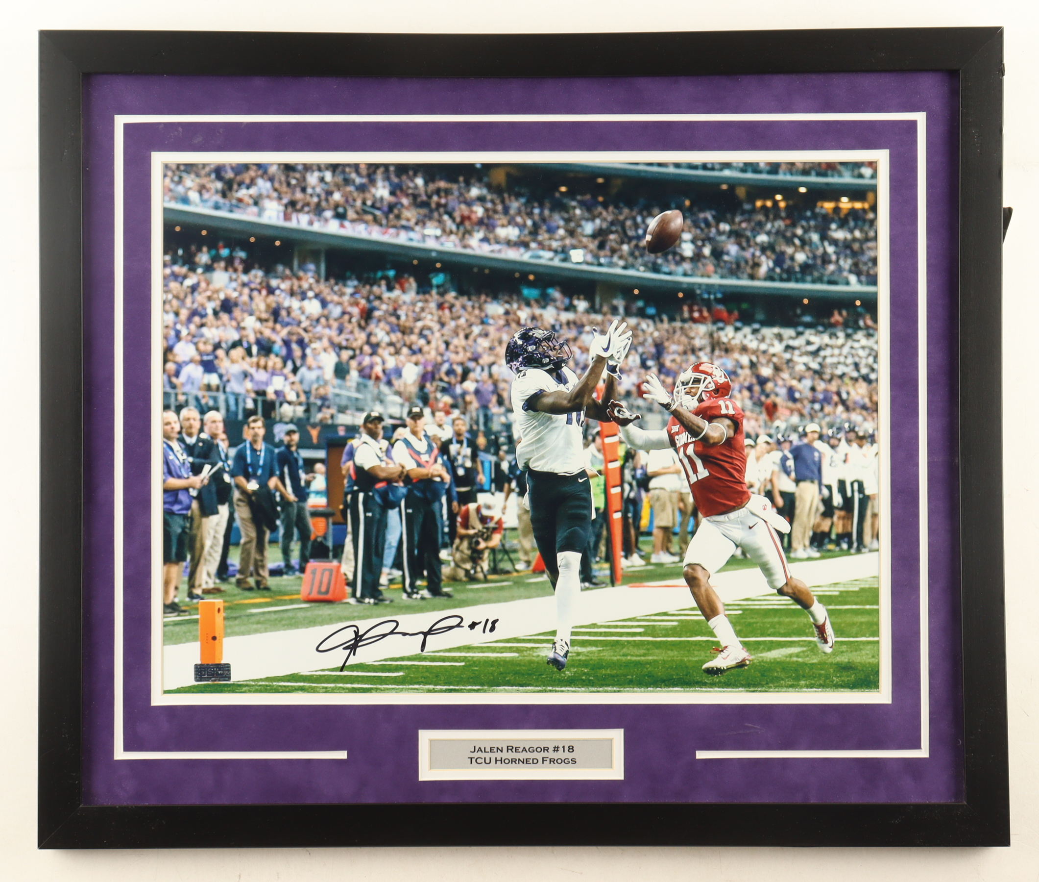Custom frame measures approximately 22" x 26" in size and features a Photo that has been hand-signed by Jalen Reagor (TCU Horned Frogs). Please note the framing is scuffed throughout.