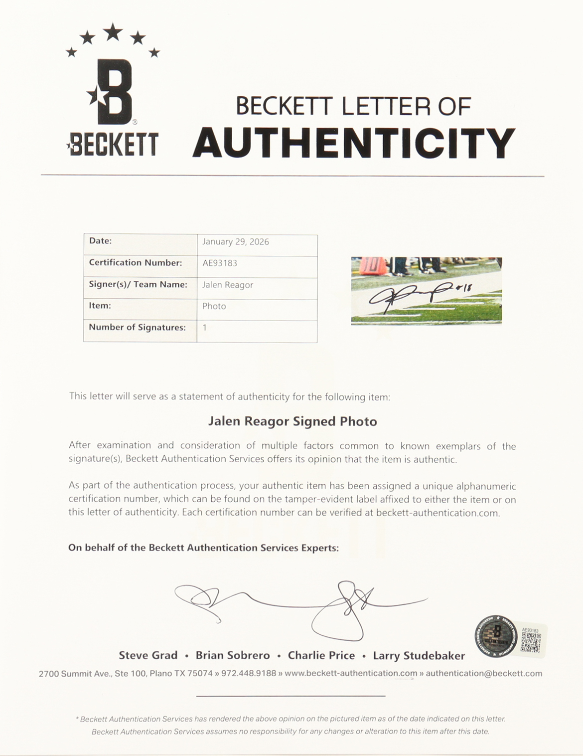 The autograph includes an official Beckett Authentication Services hologram and matching LOA for authenticity purposes.