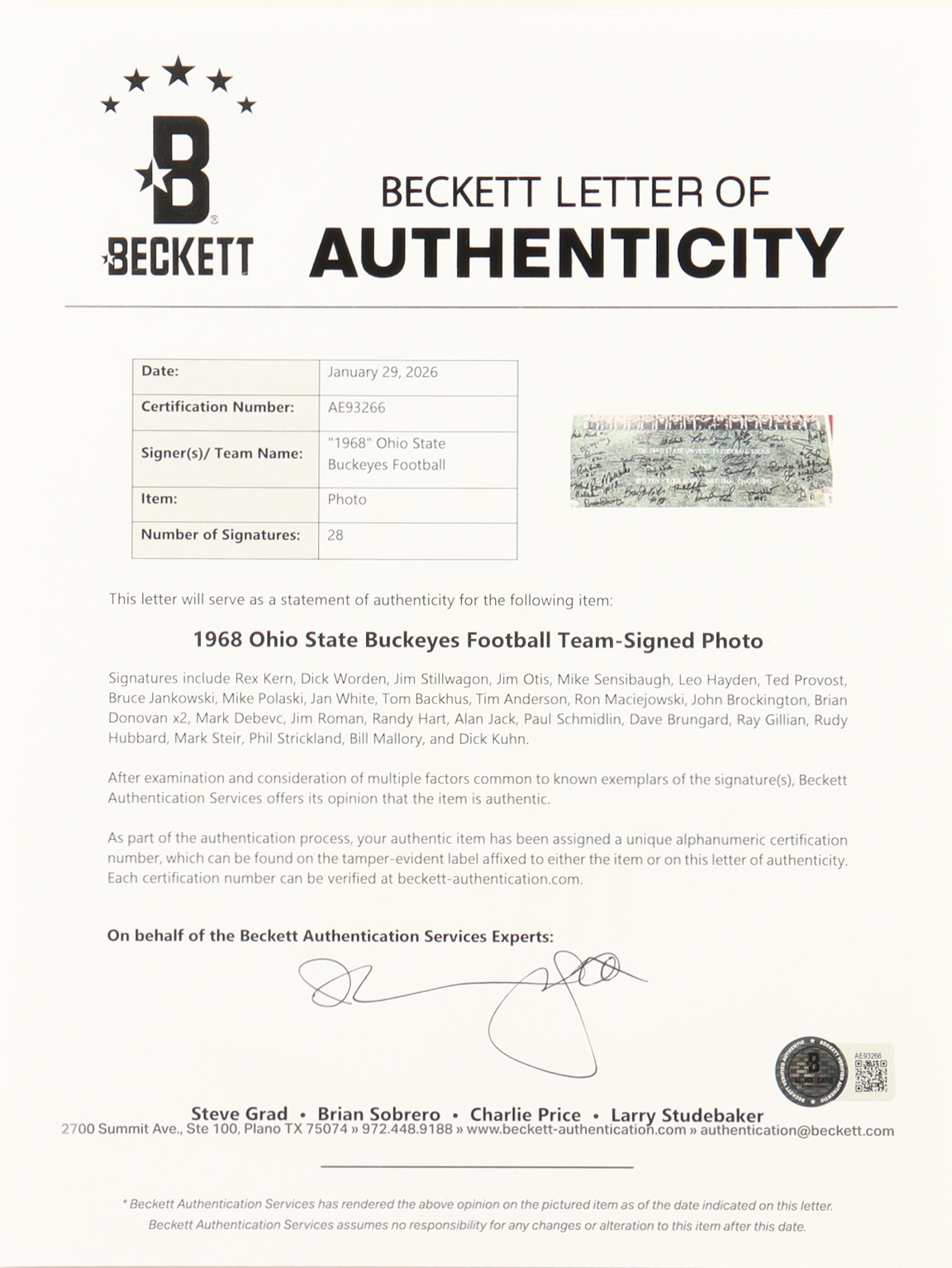 Custom frame measures approximately 22" x 26" in size and has been hand-signed by (28) members of the 1968 Ohio State Buckeyes including: Rex Kern, Dick Worden, Jim Stillwagon, Jim Otis, Mike Sensibaugh, Leo Hayden, Ted Provost, Bruce Jankowski, Mike Polaski, Jan White, Tom Backhus, Tim Anderson, Ron Maciejowski, John Brockington, Brian Donovan x2, Mark Debevc, Jim Roman, Randy Hart, Alan Jack, Paul Schmidlin, Dave Brungard, Ray Gillian, Rudy Hubbard, Mark Steir, Phil Strickland, Bill Mallory, and Dick Kuhn.
