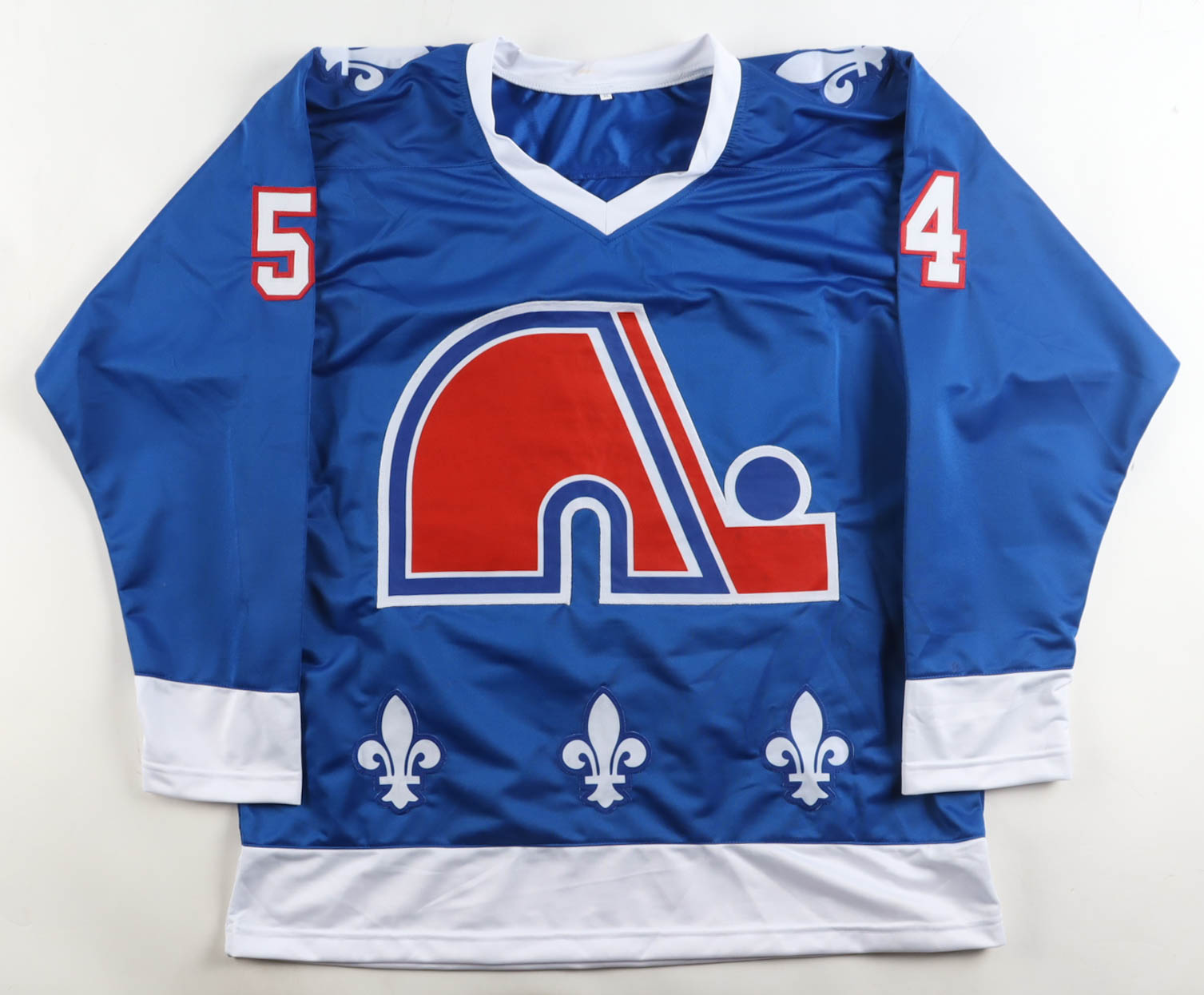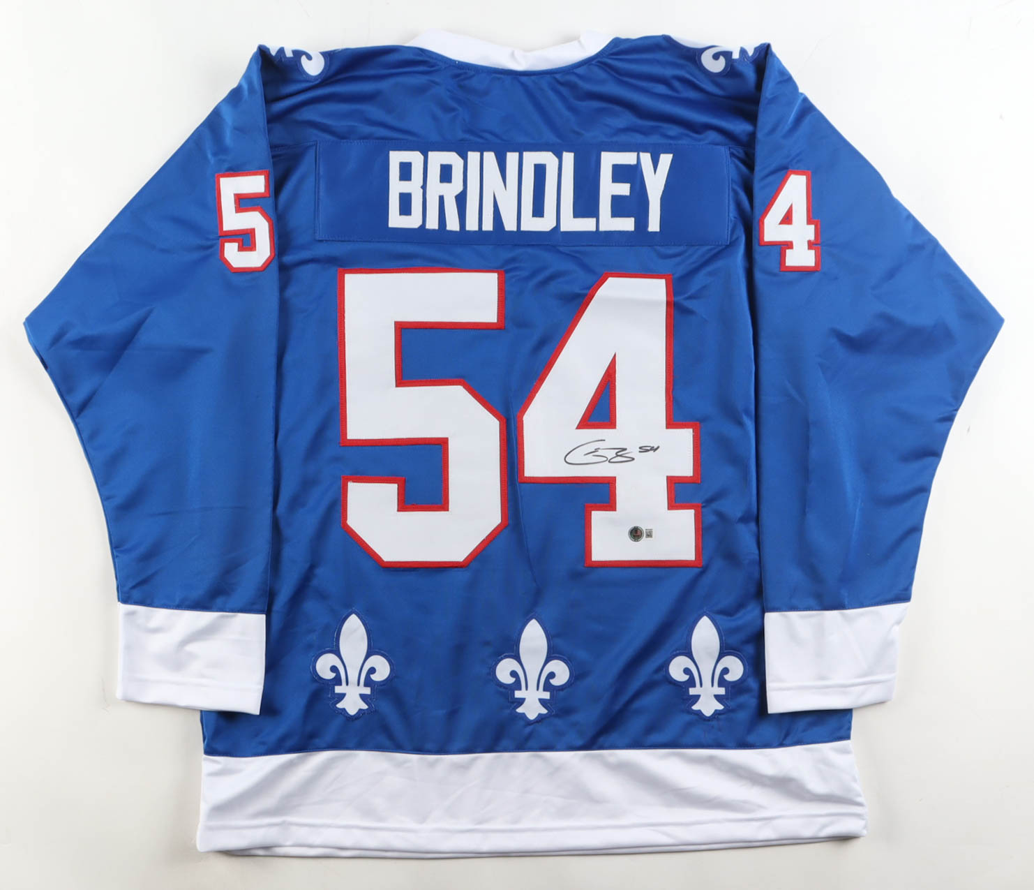 Custom jersey with everything sewn on, size XL. Hand-signed by Gavin Brindley (Quebec Nordiques).